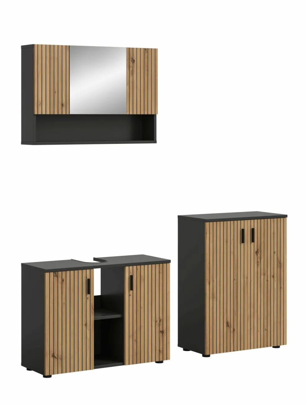1 armoire de toilette avec 3 portes (dont 1 porte miroir), 3 tablettes amovibles et 1 casier ouvert