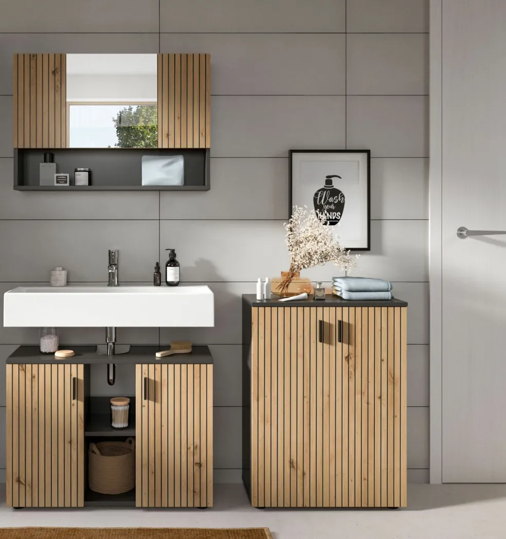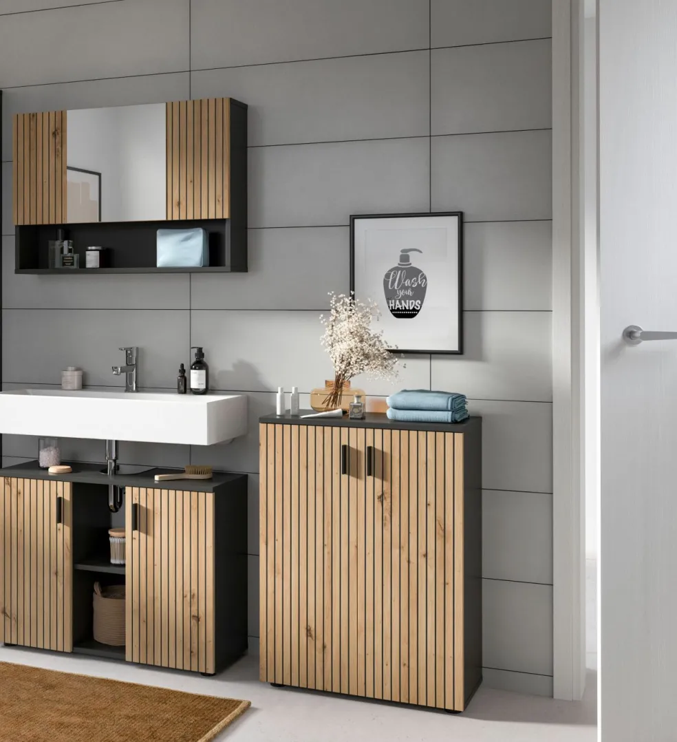 1 meuble sous lavabo avec 2 portes, 3 tablettes amovibles et 2 casiers ouverts
