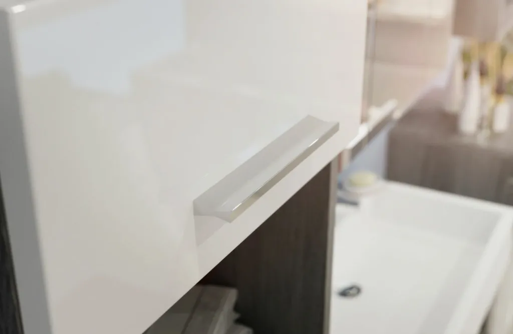 Façade : MDF (panneaux de fibres de bois de densité moyenne ) thermoformé ton blanc ultra brillant / miroir