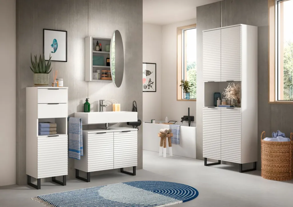 1 colonne de salle de bains avec 4 portes, 2 tablettes amovibles, 2 tablettes fixes et 1 casier ouvert