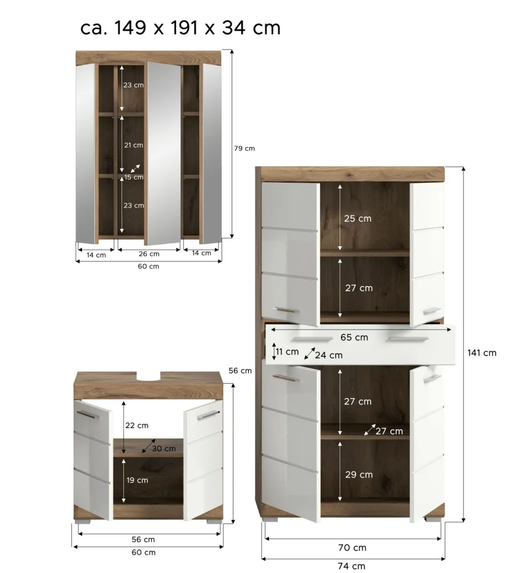 1 armoire de toilette avec 3 portes et 6 tablettes amovibles