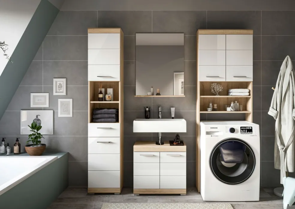 1 colonne de salle de bains avec 2 portes, 1 tiroir, 2 casiers ouverts, 2 tablettes fixes et 3 tablettes amovibles