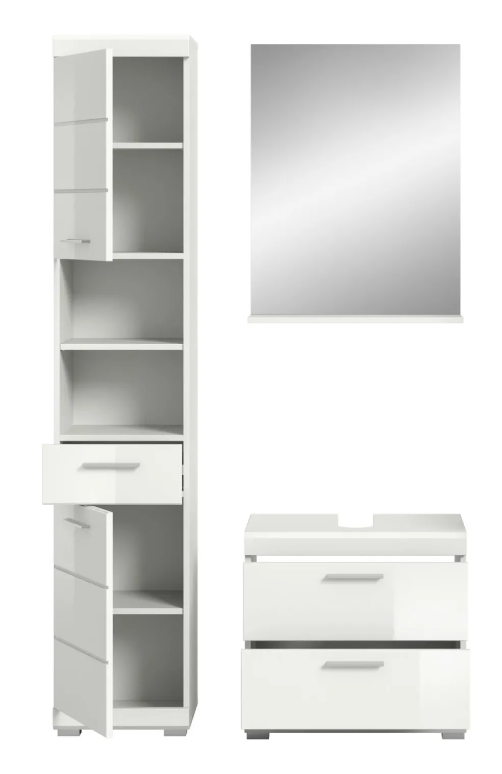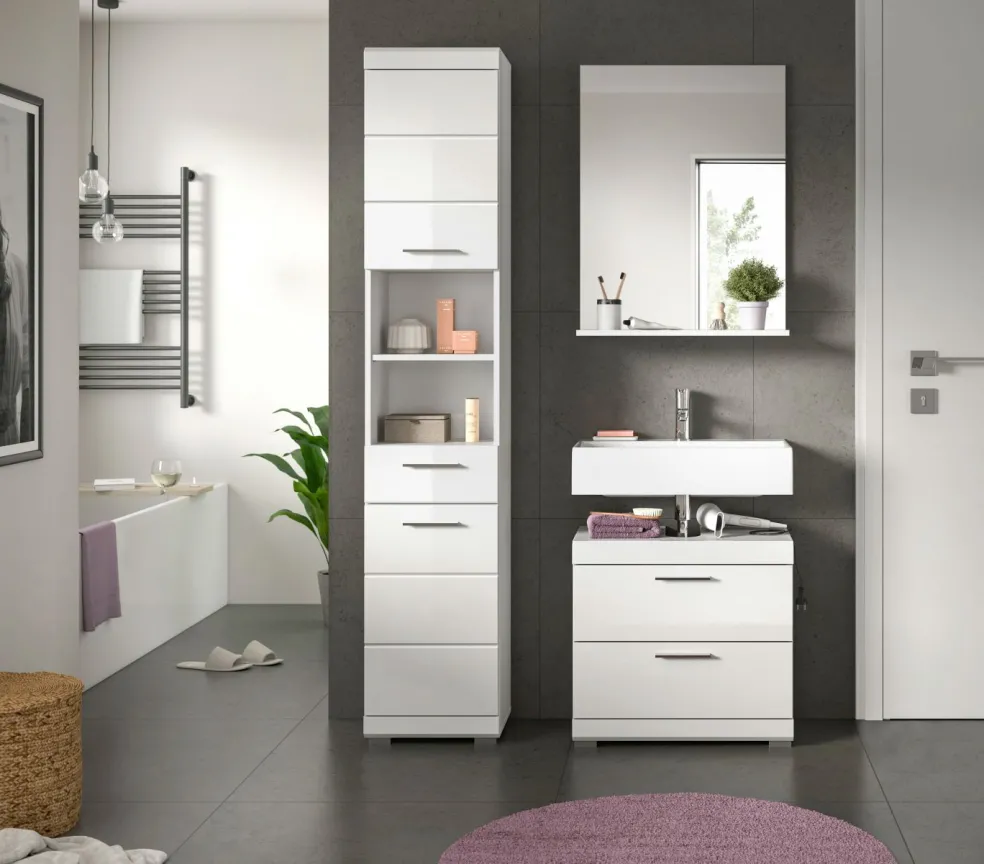 1 colonne de salle de bains avec 2 portes, 1 tiroir, 2 casiers ouverts, 2 tablettes fixes et 3 tablettes amovibles