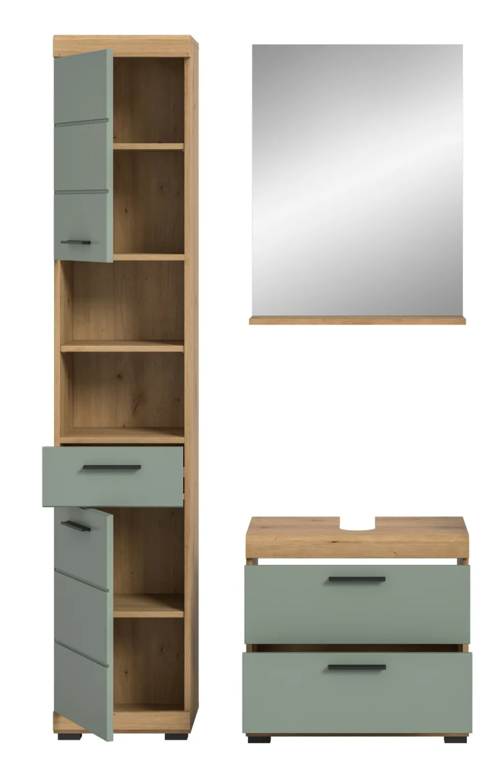 1 colonne de salle de bains avec 2 portes, 1 tiroir, 2 casiers ouverts, 2 tablettes fixes et 3 tablettes amovibles
