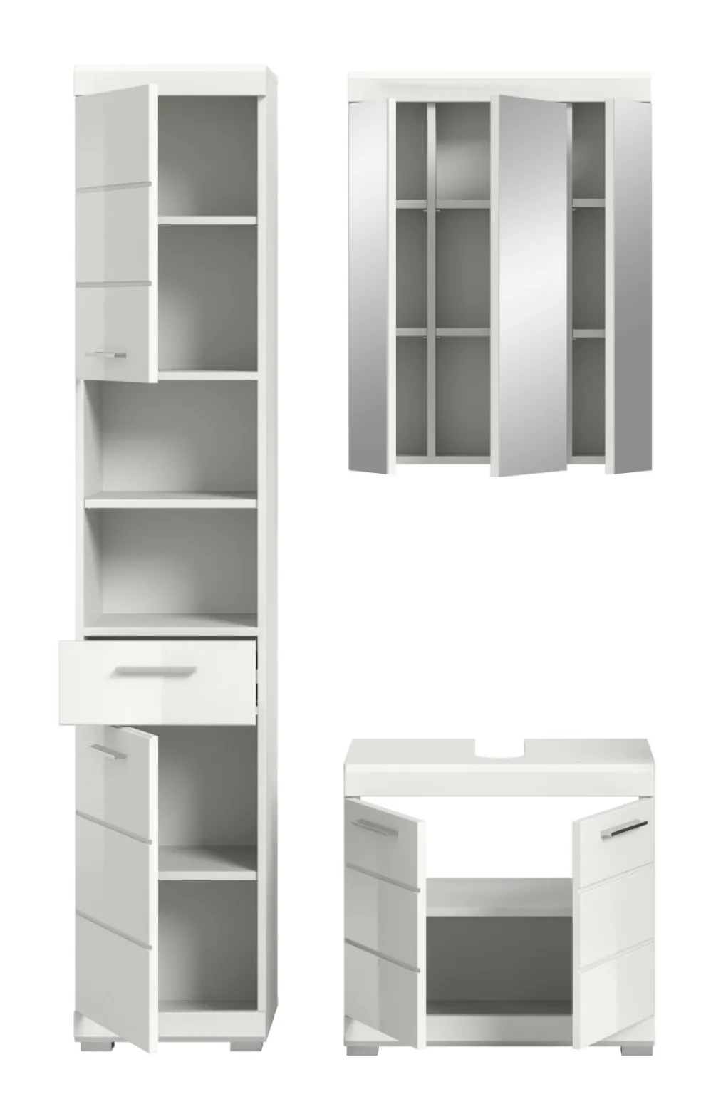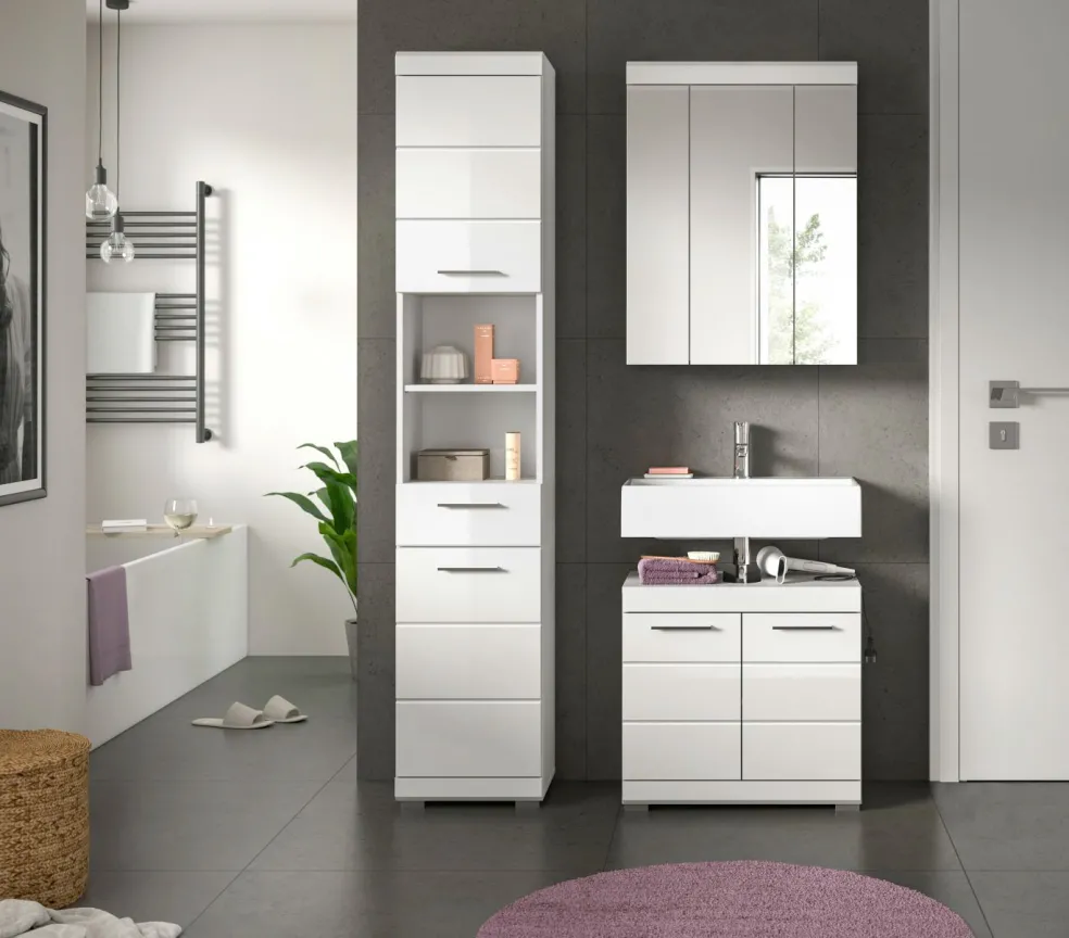 1 colonne de salle de bains avec 2 portes, 1 tiroir, 2 casiers ouverts, 2 tablettes fixes et 3 tablettes amovibles