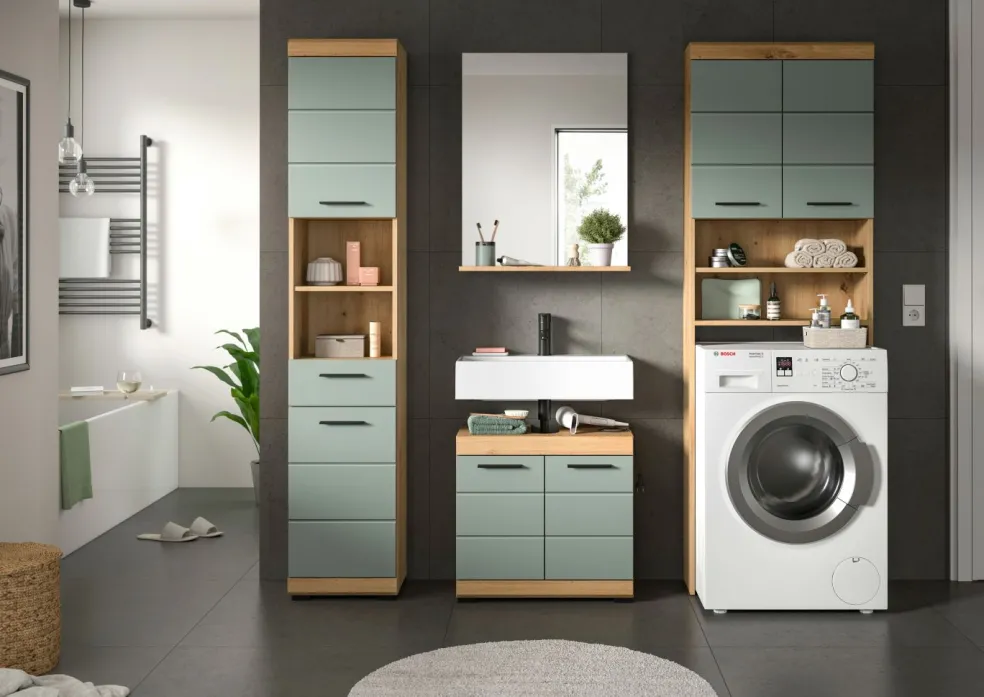 1 meuble pour machine à laver avec 2 portes, 2 casiers ouverts, 2 tablettes fixes et 3 tablettes amovibles
