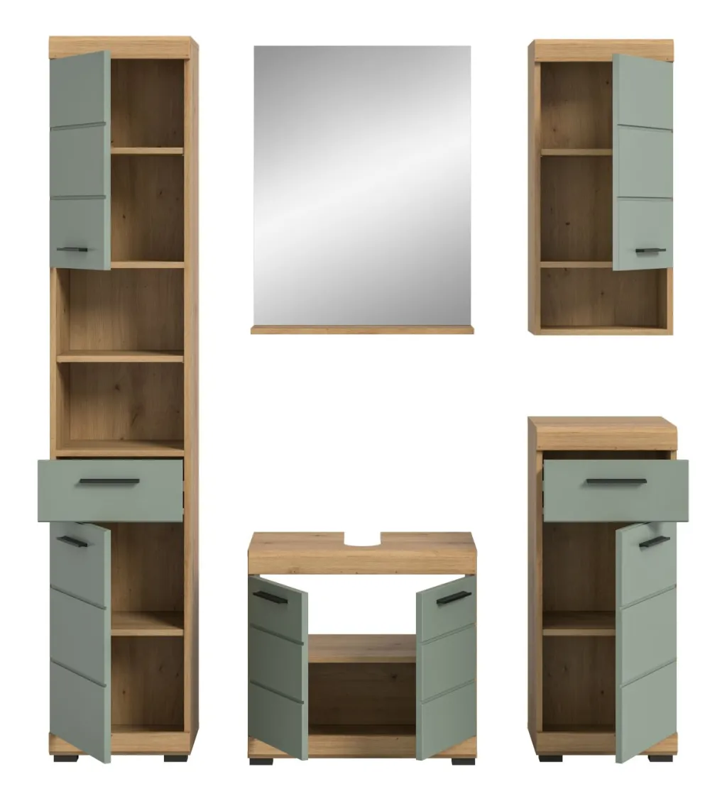 1 colonne de salle de bains avec 2 portes, 1 tiroir, 2 casiers ouverts, 2 tablettes fixes et 3 tablettes amovibles