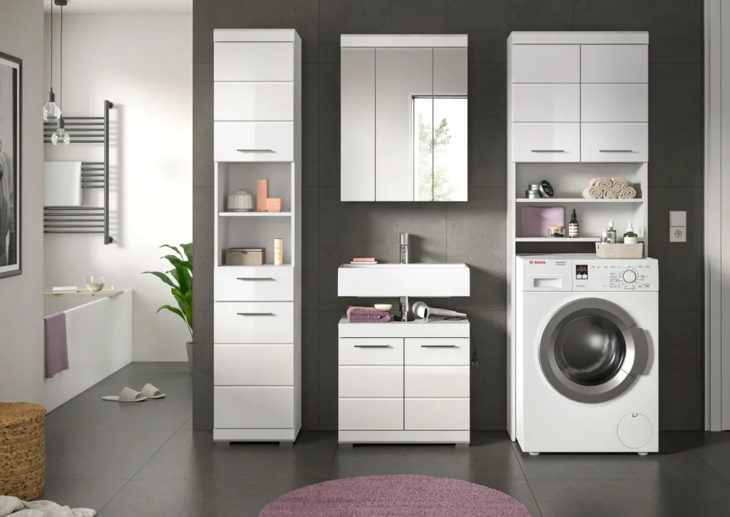 1 meuble pour machine à laver avec 2 portes, 3 tablettes amovibles, 2 casiers ouverts et 2 tablettes fixes