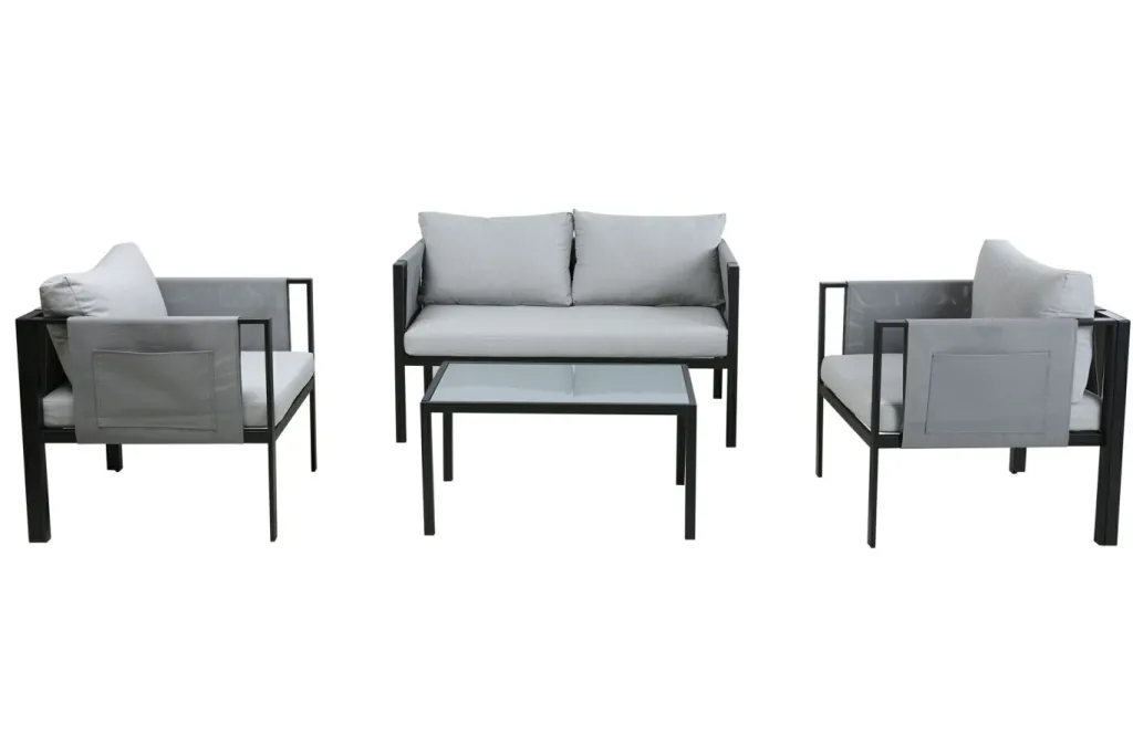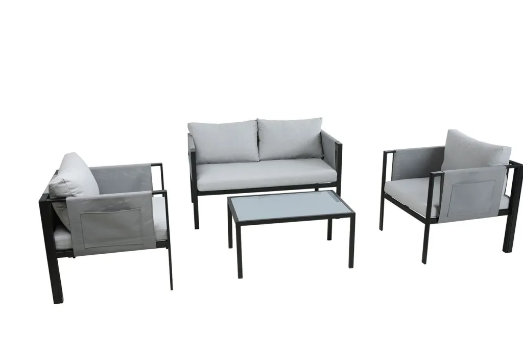 Revêtement des coussins d’assise : oléfine (polyéthylène ou polypropylène) ton gris