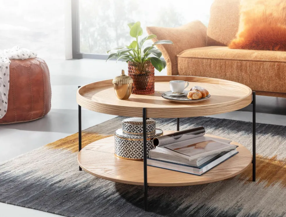 Anneau au niveau du plateau : bois de tulipier (Inde) avec placage chêne
