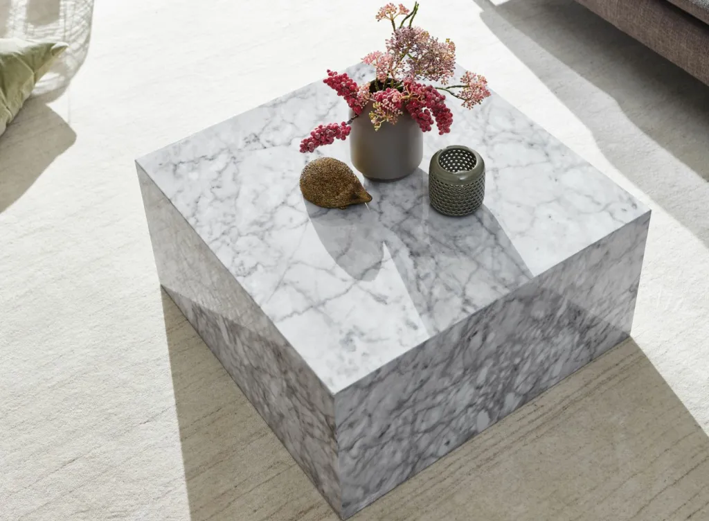 Table complète : MDF (panneau de fibres de bois de moyenne densité) pelliculé ton blanc (aspect marbre ultra brillant)