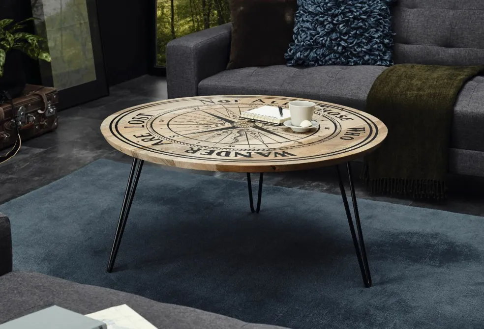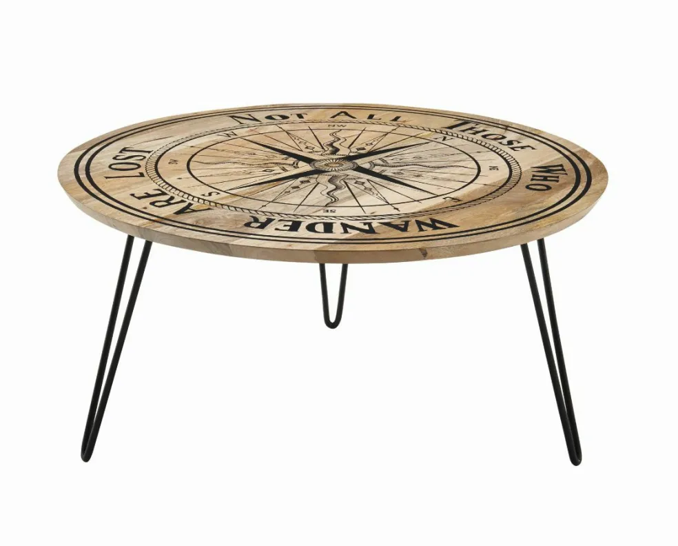 Plateau de table : bois de manguier massif (Inde) avec motif imprimé boussole
