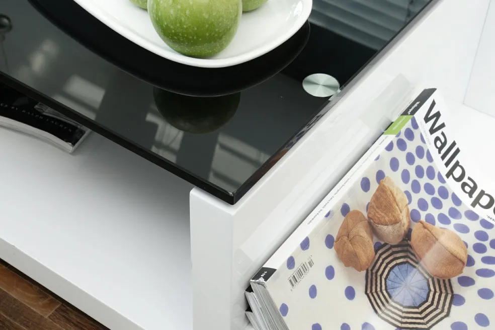 MDF (panneau de fibres de bois de moyenne densité) laqué ton blanc ultra brillant avec plateau de table en verre de sécurité