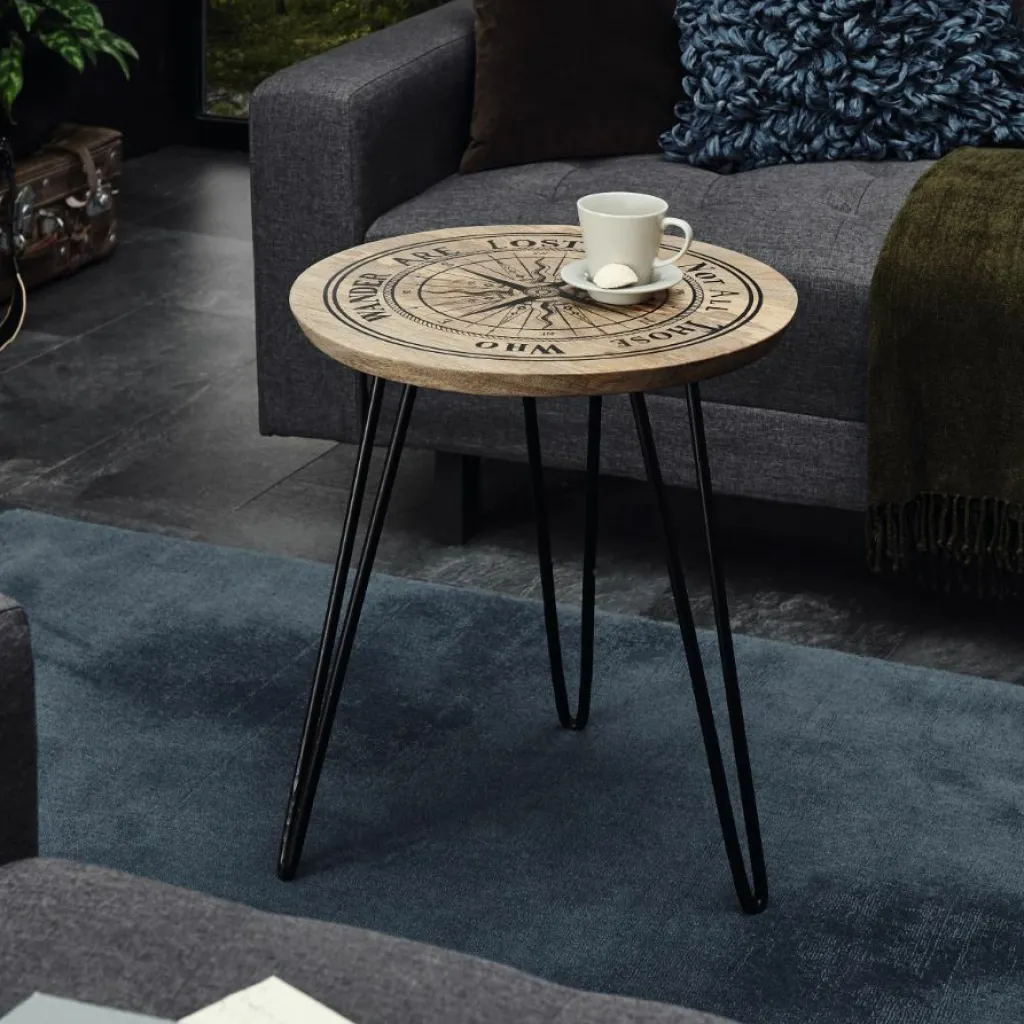 Plateau de table : bois de manguier massif (Inde) avec motif imprimé boussole