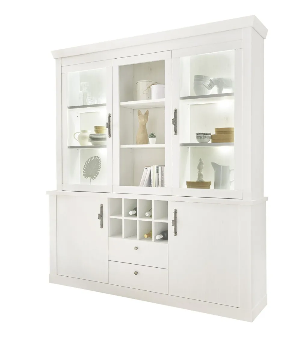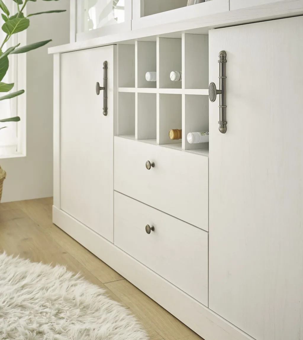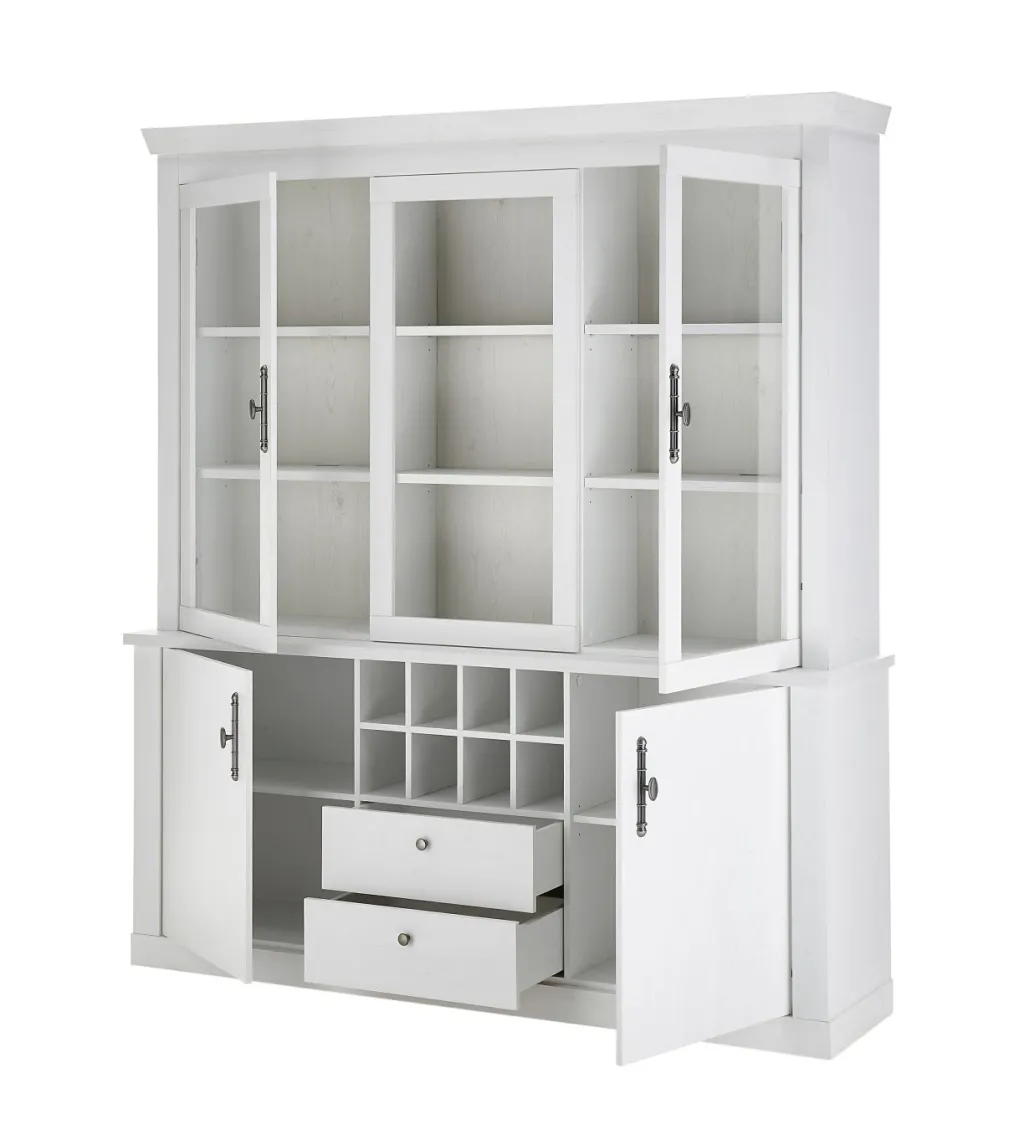 Au centre : 2 tiroirs et 1 rangement pour bouteilles avec 8 casiers
