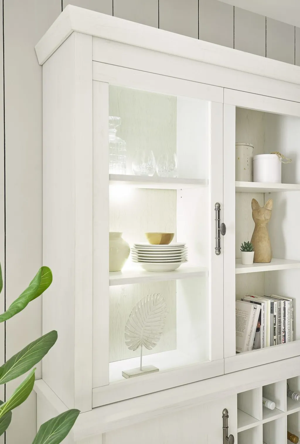 Partie supérieure comprenant 2 portes en verre avec encadrement et, derrière chacune d’elles, 2 tablettes en verre