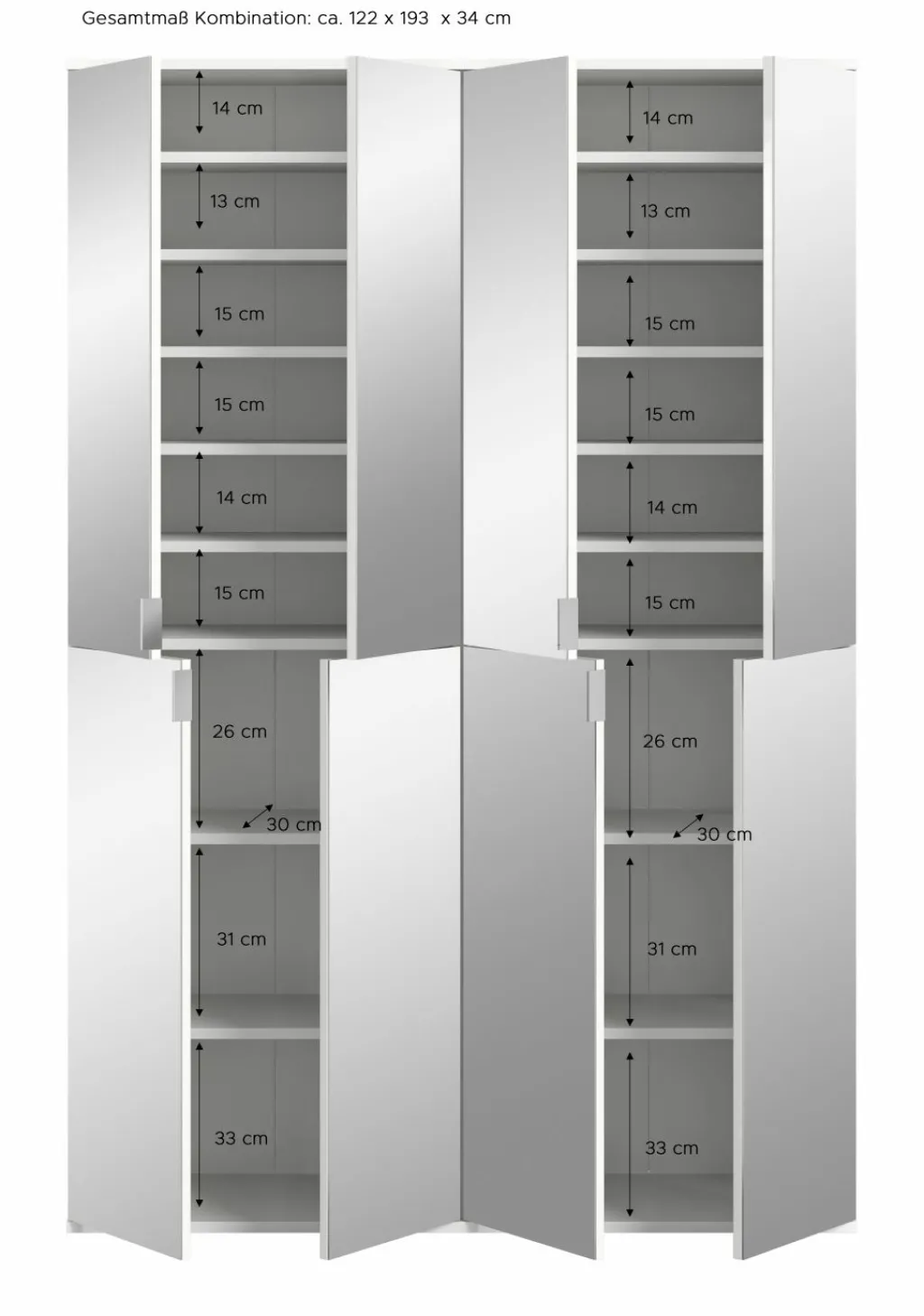 2 armoires d’entrée avec chacune 2 portes, 7 tablettes amovibles, 1 tablette fixe et 1 barre de penderie