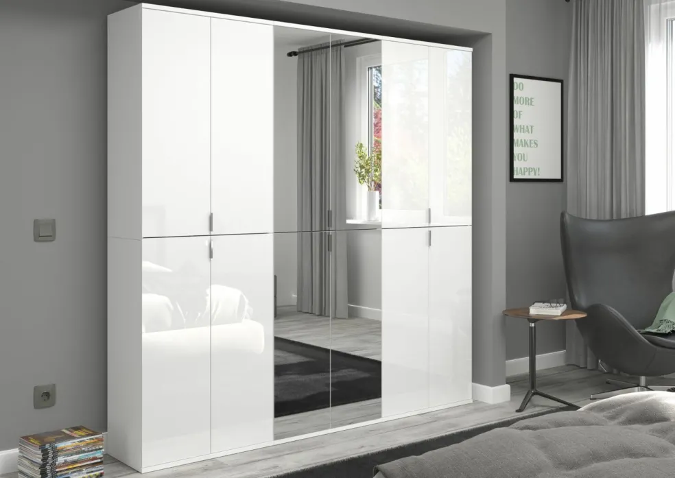 1 armoire d’entrée comprenant 2 portes avec miroir, 7 tablettes amovibles, 1 tablette fixe et 1 barre de penderie