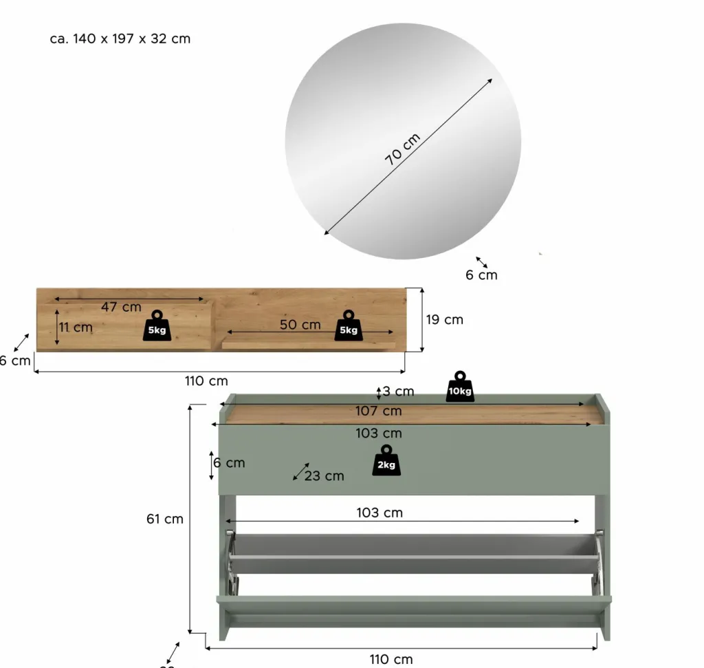 1 meuble à chaussures avec 1 tiroir, 1 abattant et 1 rangement pour chaussures, à suspendre