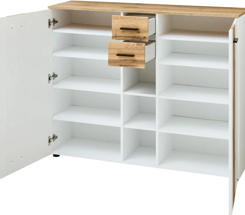 1 meuble à chaussures avec 3 casiers ouverts, 2 portes, 2 tiroirs et 10 tablettes