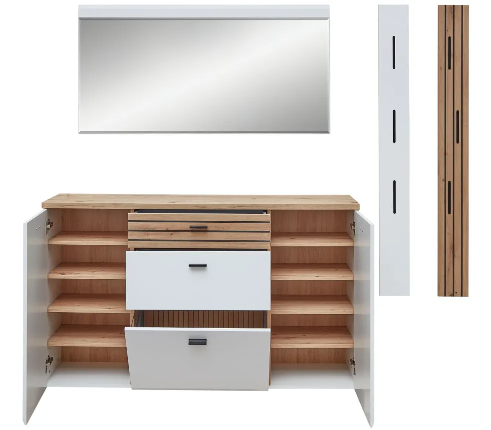 1 meuble à chaussures à suspendre avec 2 portes, 2 tiroirs, 1 abattant avec rangement pour chaussures et 8 tablettes