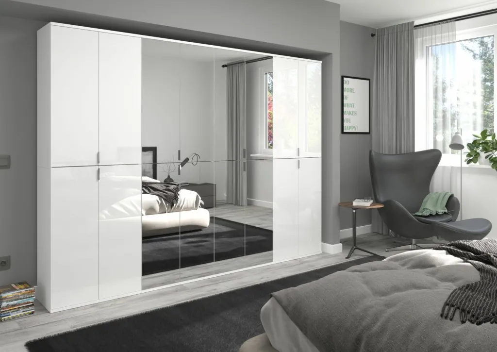 2 armoires d’entrée comprenant chacune 2 portes avec miroir, 7 tablettes amovibles, 1 tablette fixe et 1 barre de penderie
