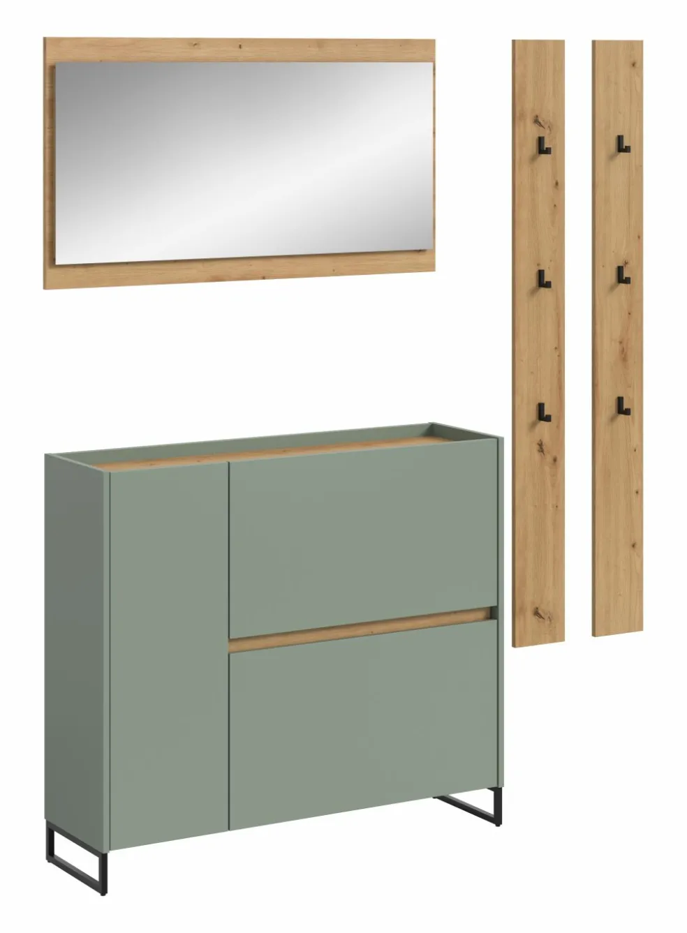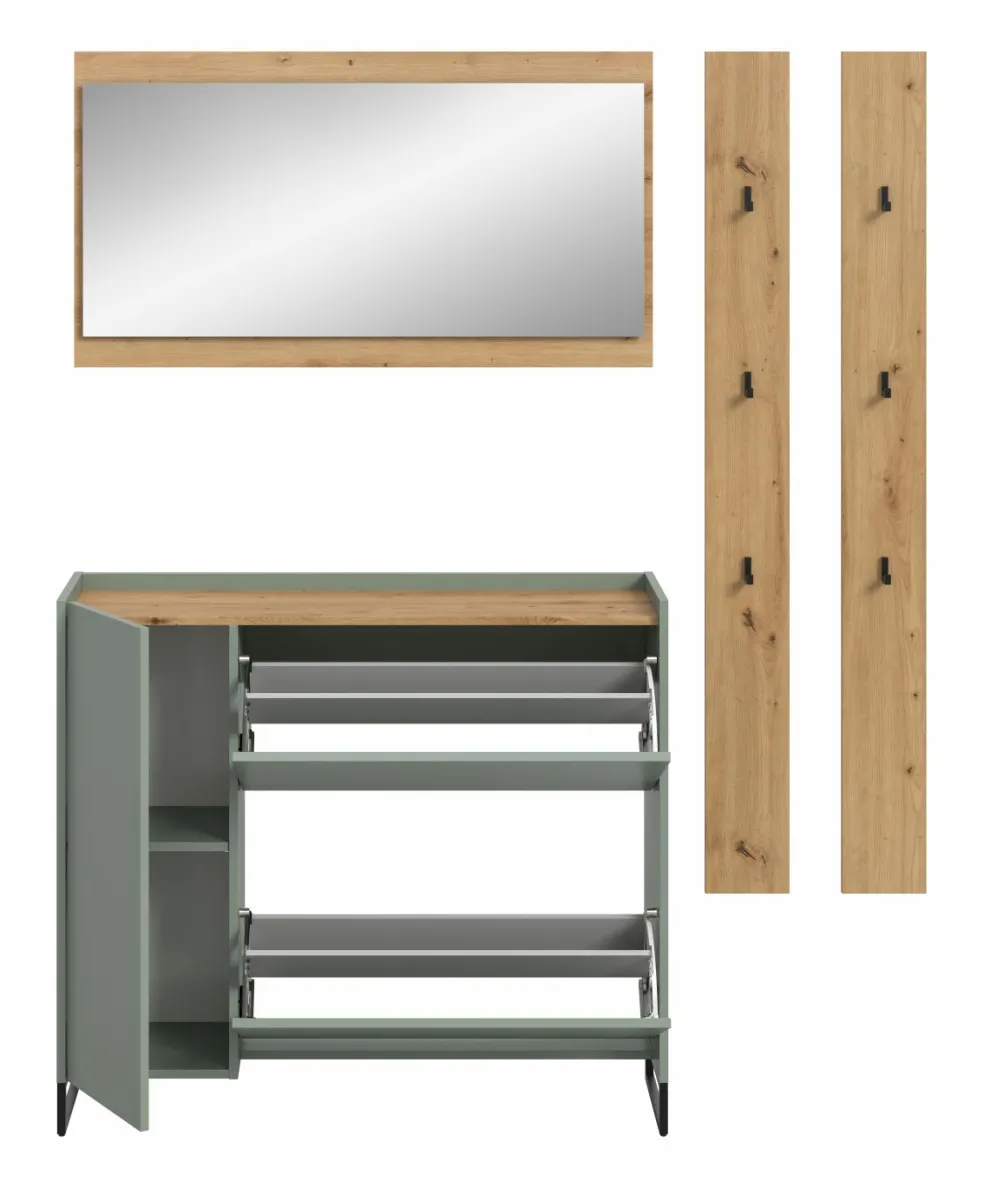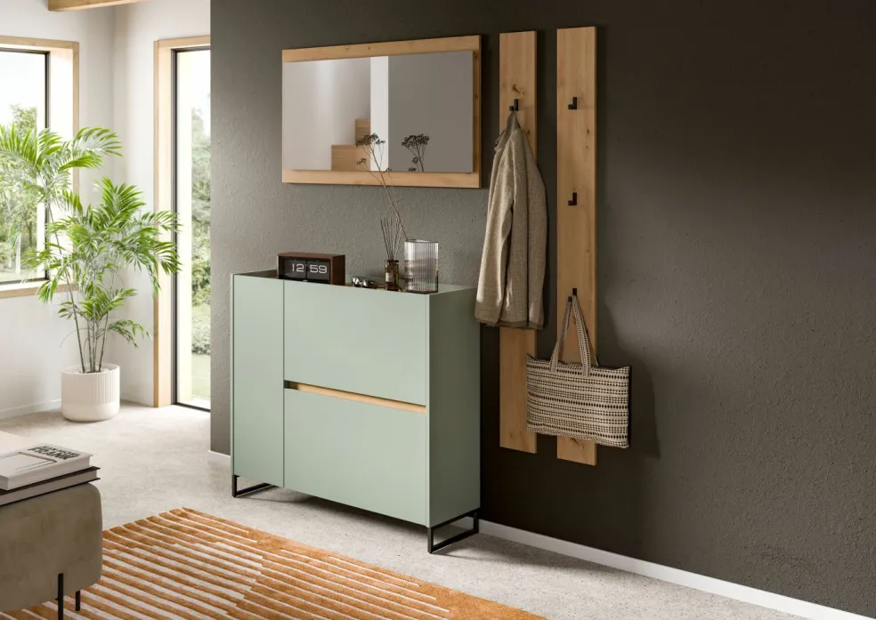 Façade : ton sauge et décor chêne Artisan / miroir