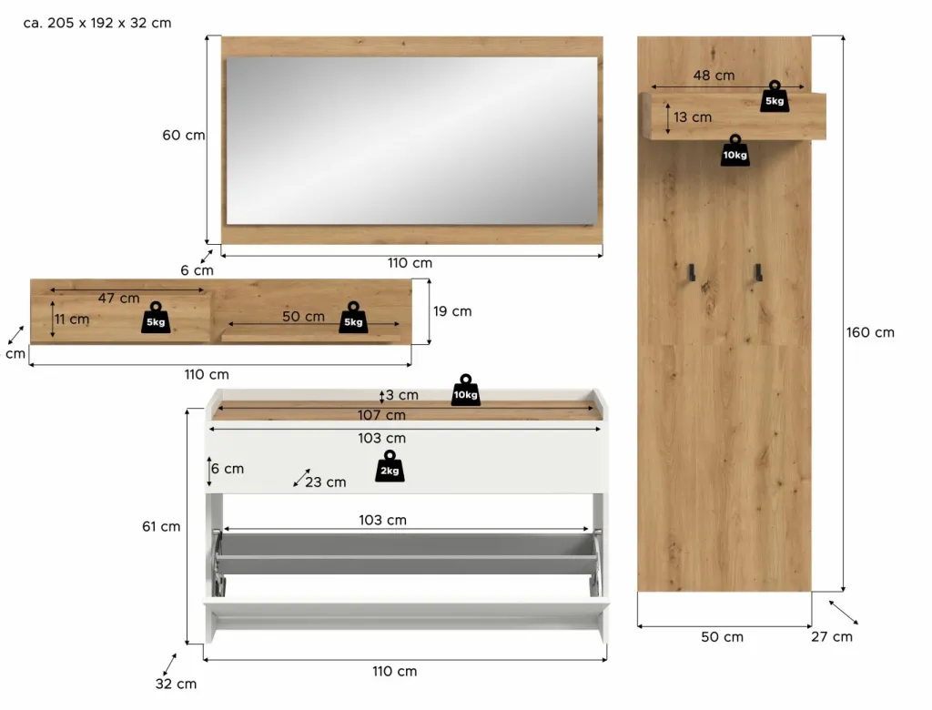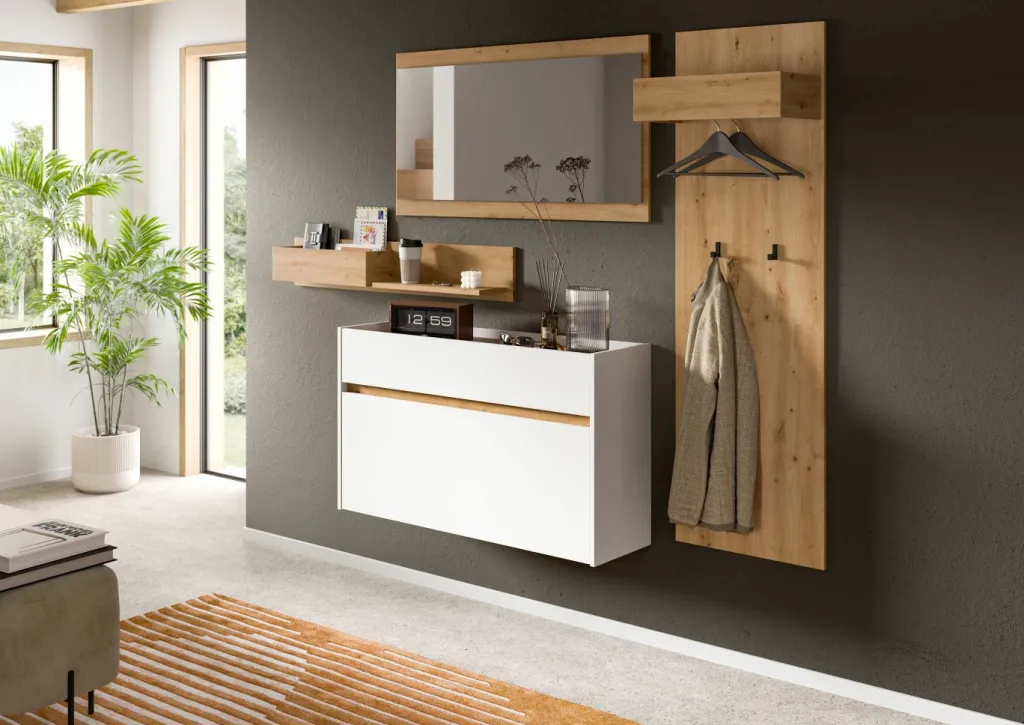 1 meuble à chaussures avec 1 tiroir, 1 abattant et 1 rangement pour chaussures, à suspendre