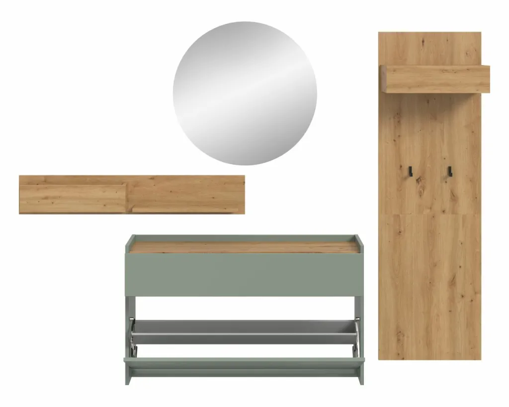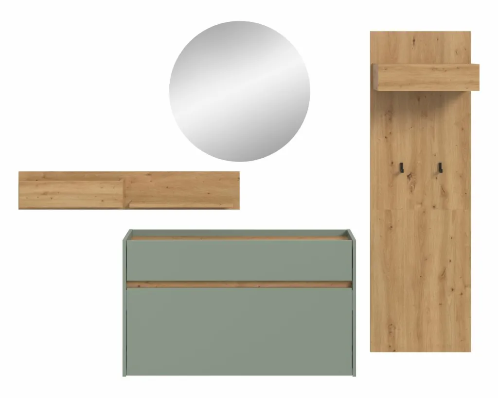 Façade : ton sauge et décor chêne Artisan / miroir