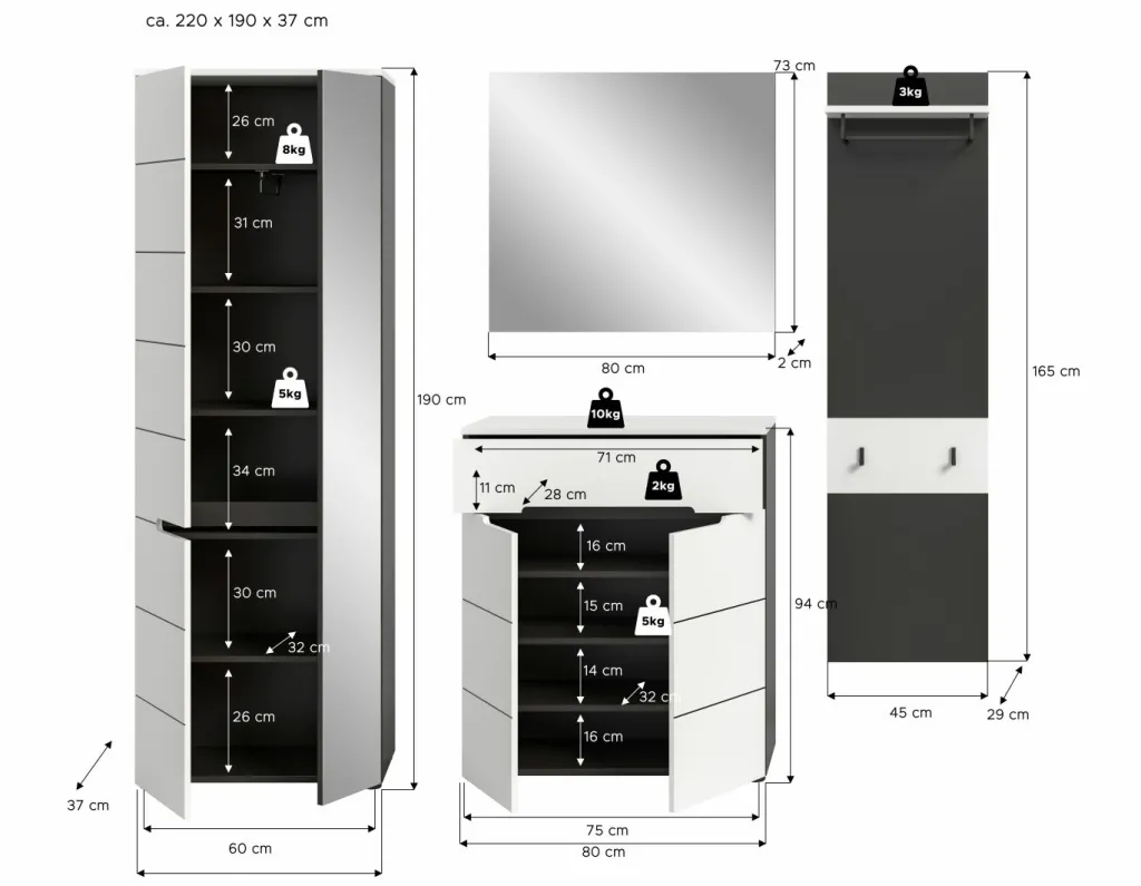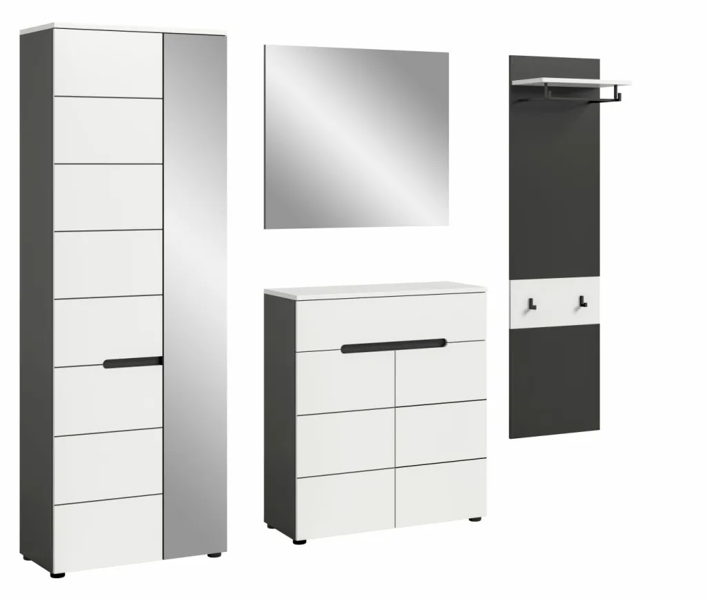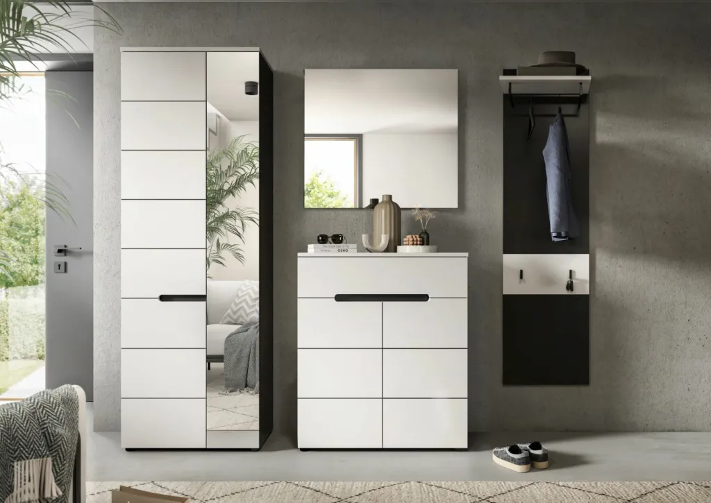 1 armoire d’entrée avec 2 portes (dont 1 porte avec miroir), 1 tablette fixe, 1 barre de penderie et 4 tablettes amovibles