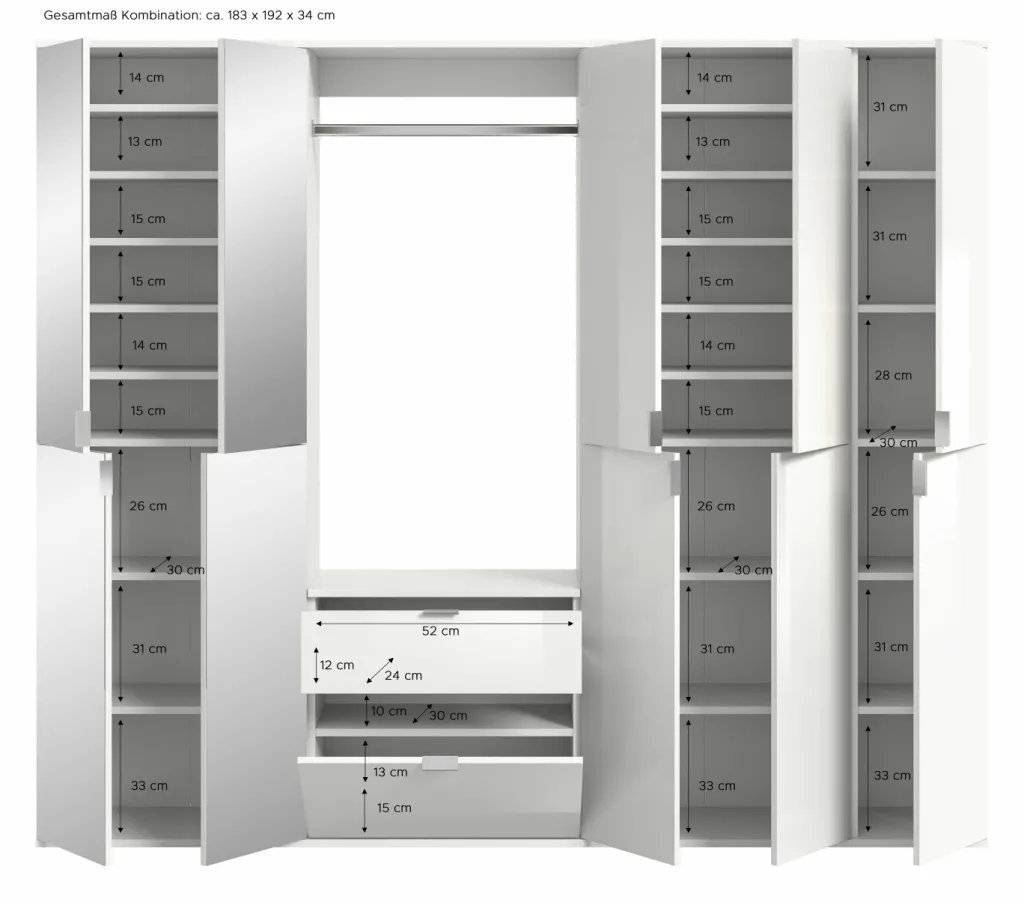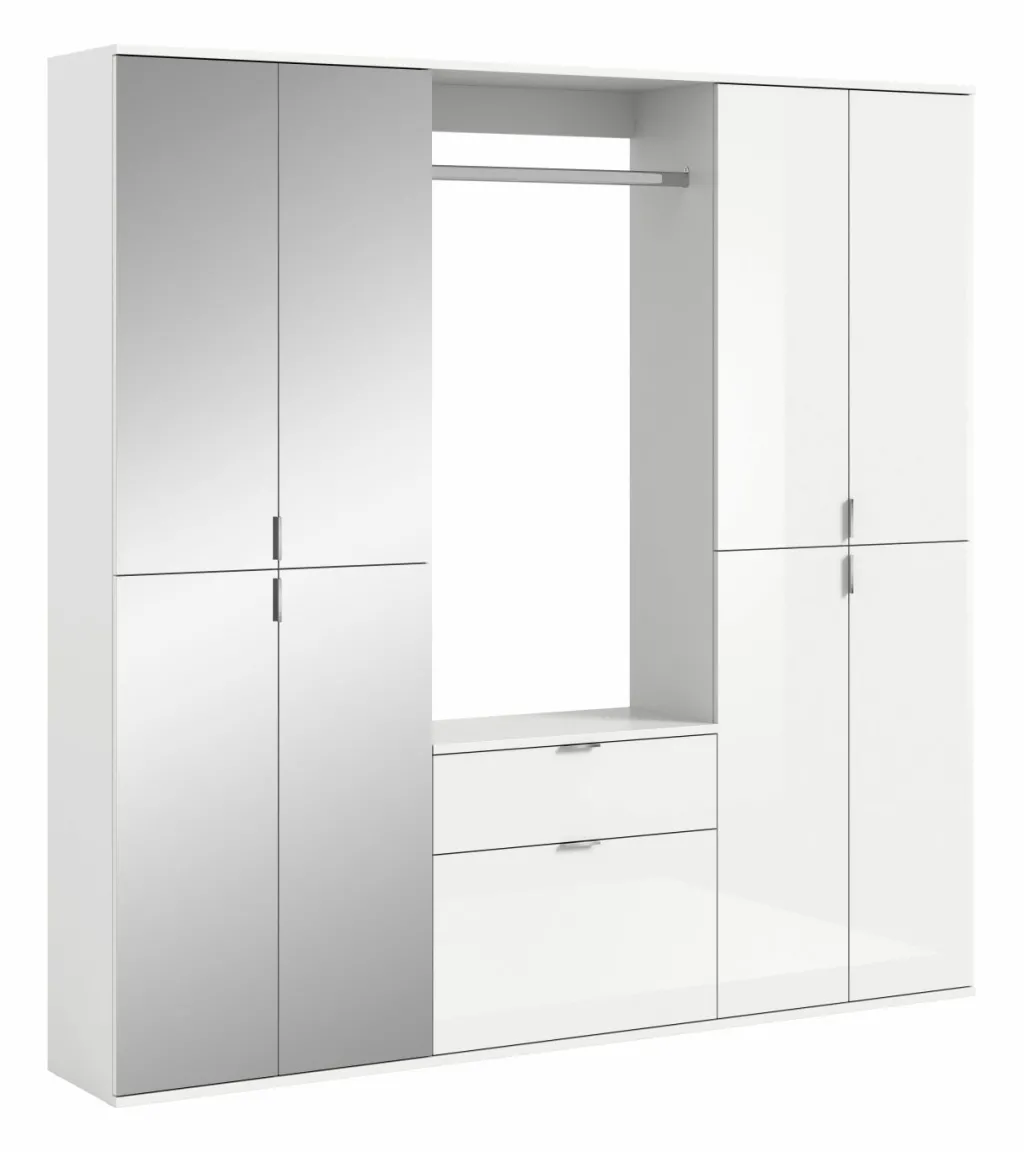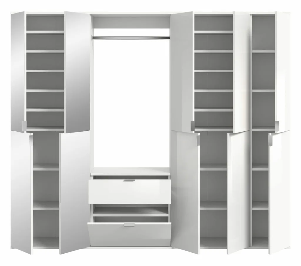 1 armoire d’entrée comprenant 2 portes avec ton blanc ultra brillant, 7 tablettes amovibles, 1 tablette fixe et 1 barre de penderie