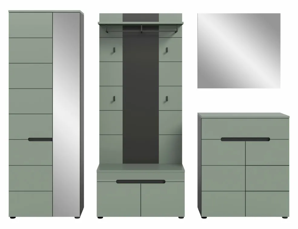 1 armoire d’entrée avec 2 portes (dont 1 porte avec miroir), 1 tablette fixe, 1 barre de penderie et 4 tablettes amovibles
