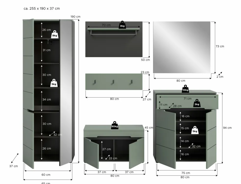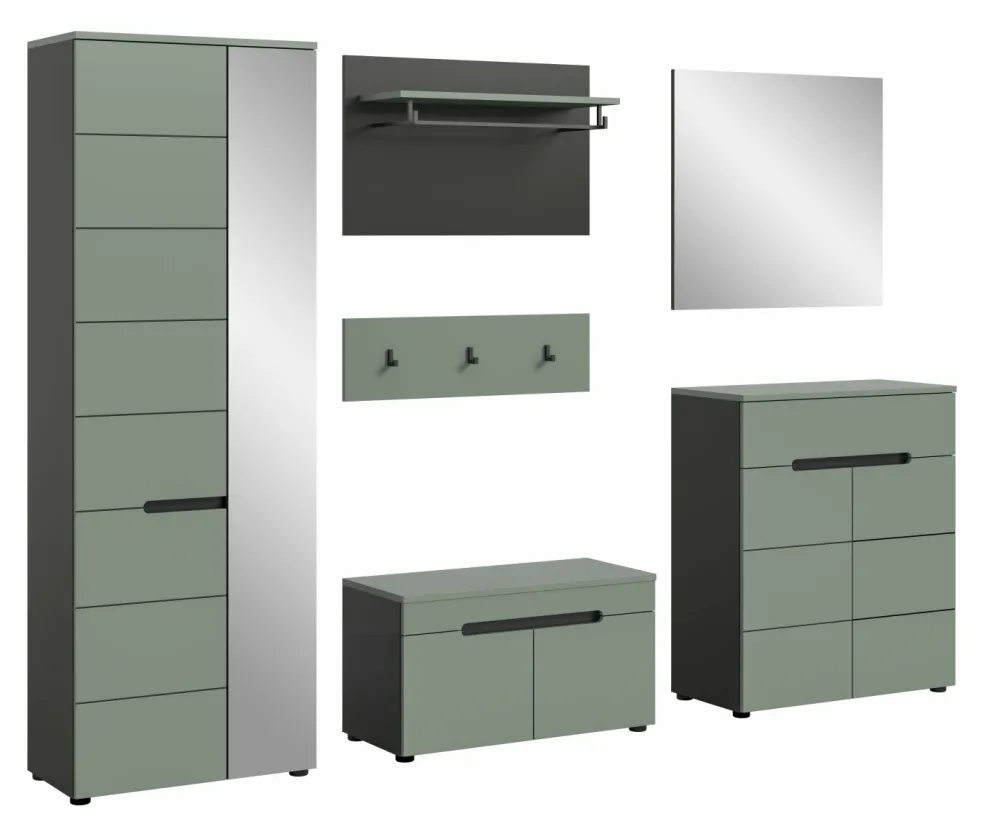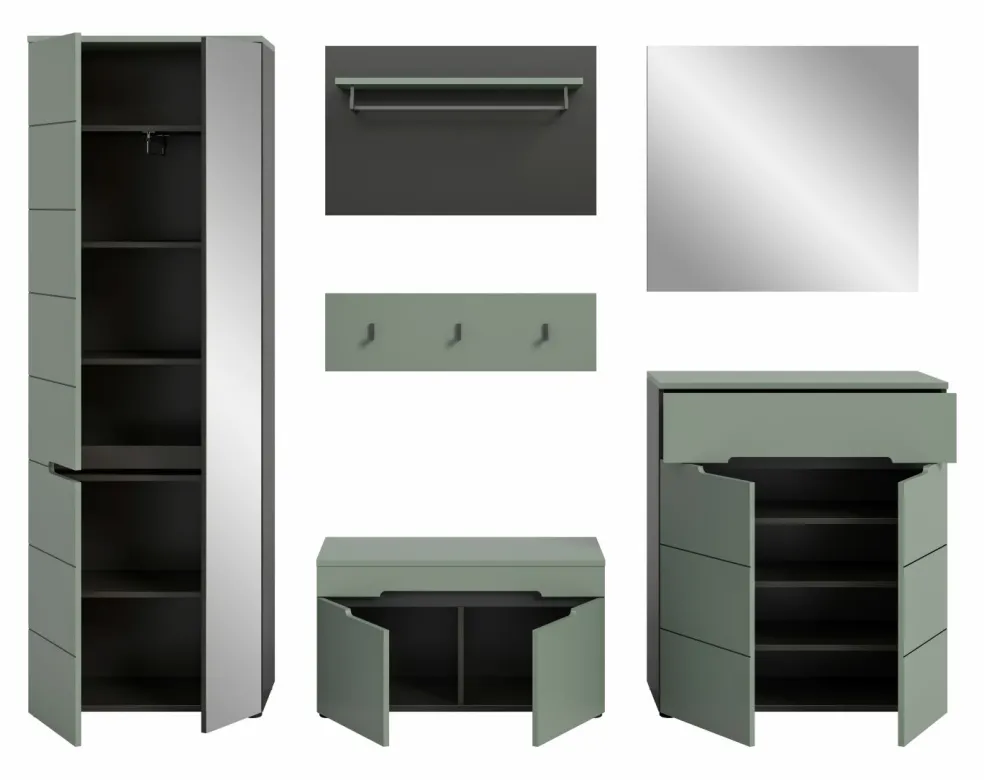 1 armoire d’entrée avec 2 portes (dont 1 porte avec miroir), 1 tablette fixe, 1 barre de penderie et 4 tablettes amovibles
