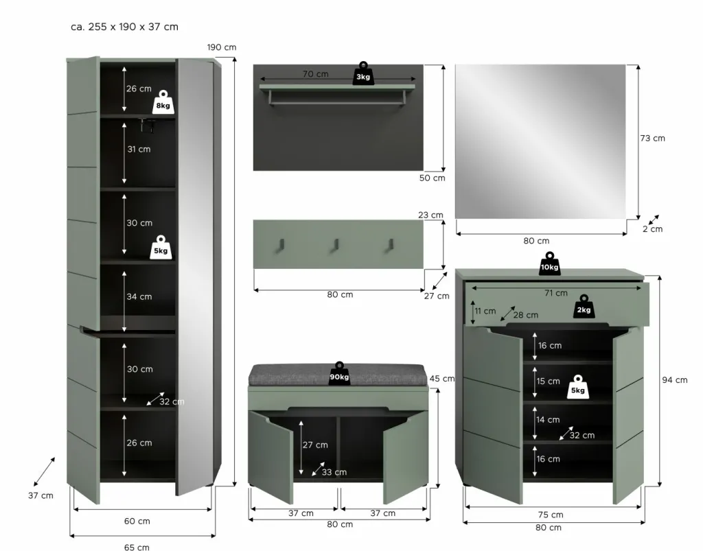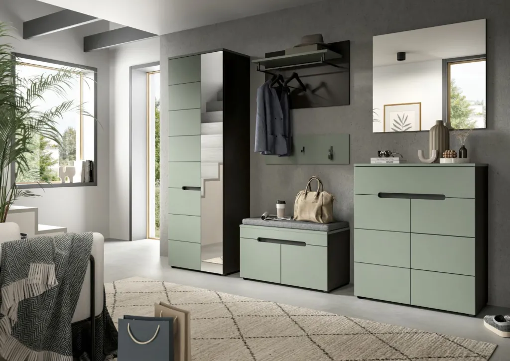 1 armoire d’entrée avec 2 portes (dont 1 porte avec miroir), 1 tablette fixe, 1 barre de penderie et 4 tablettes amovibles