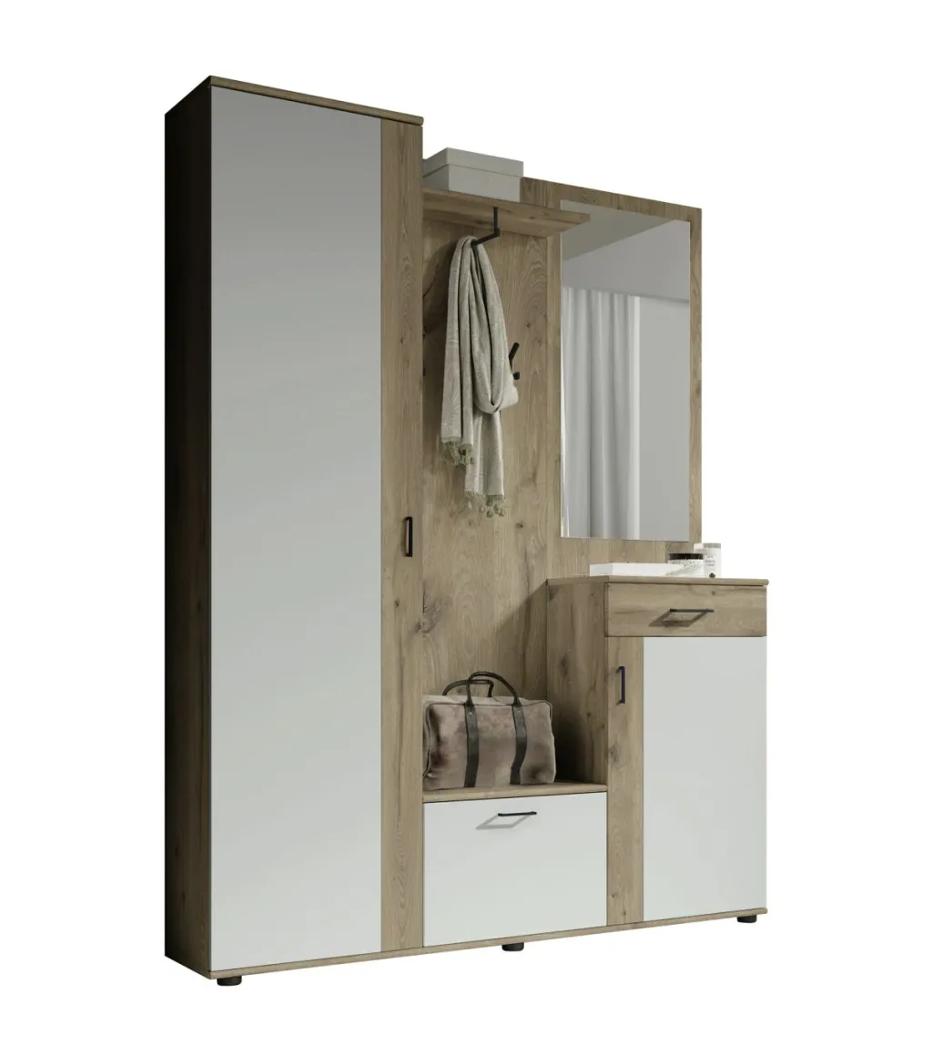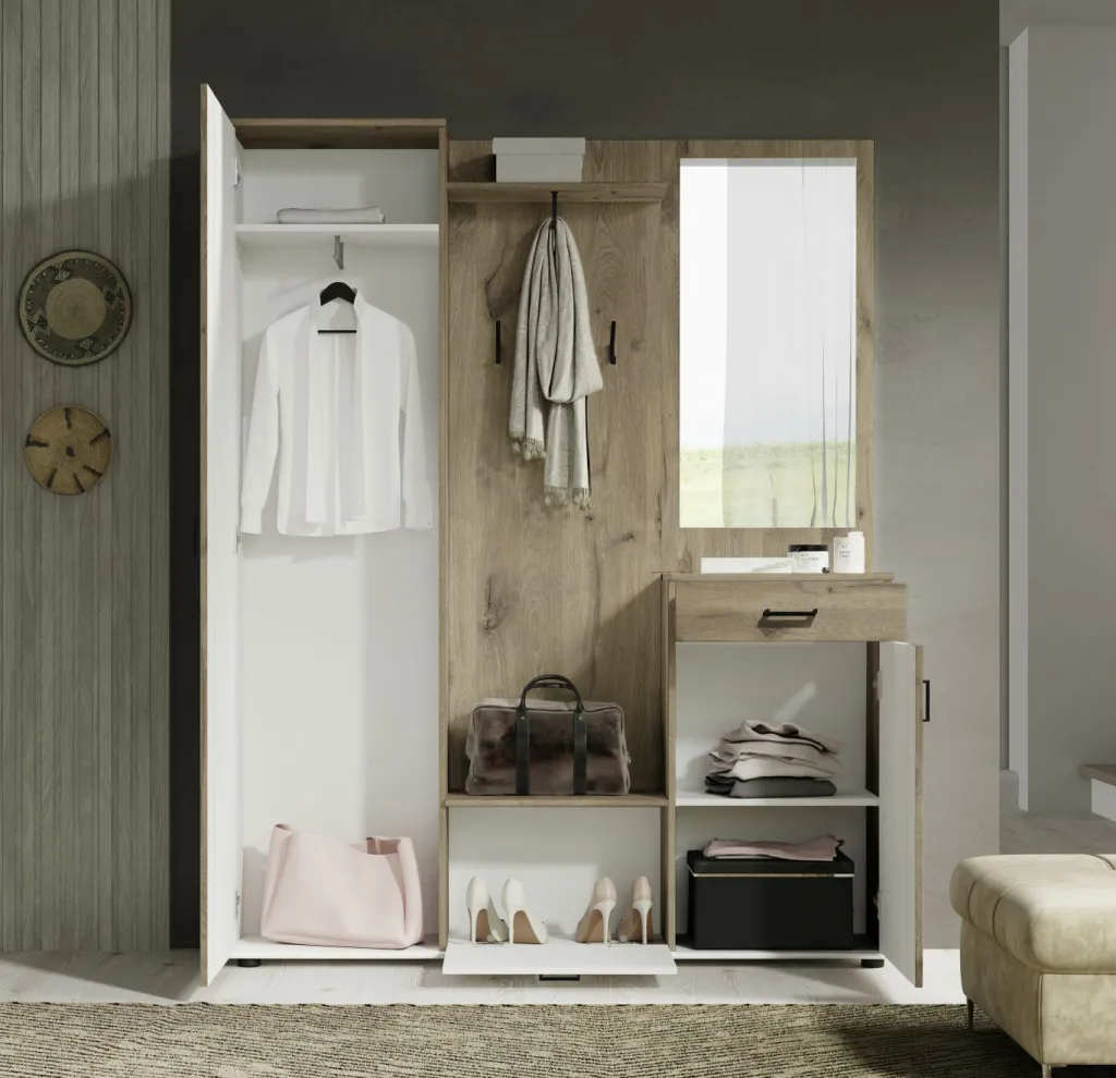 1 panneau portemanteau avec 1 tablette porte chapeaux, 1 barre de penderie et 2 crochets à vêtements