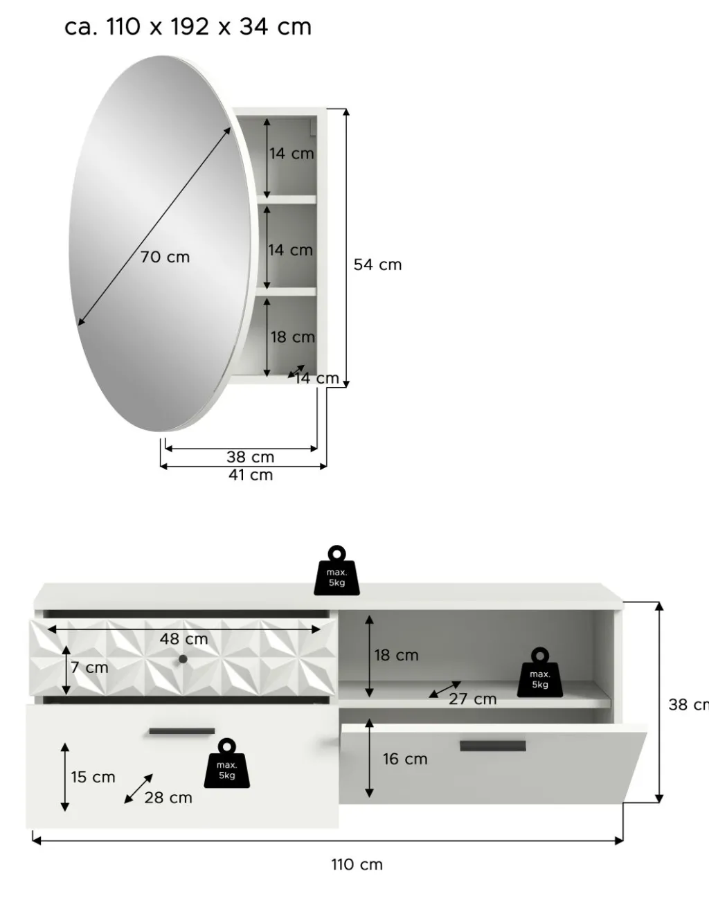 1 miroir avec 1 porte et 1 tablette amovible