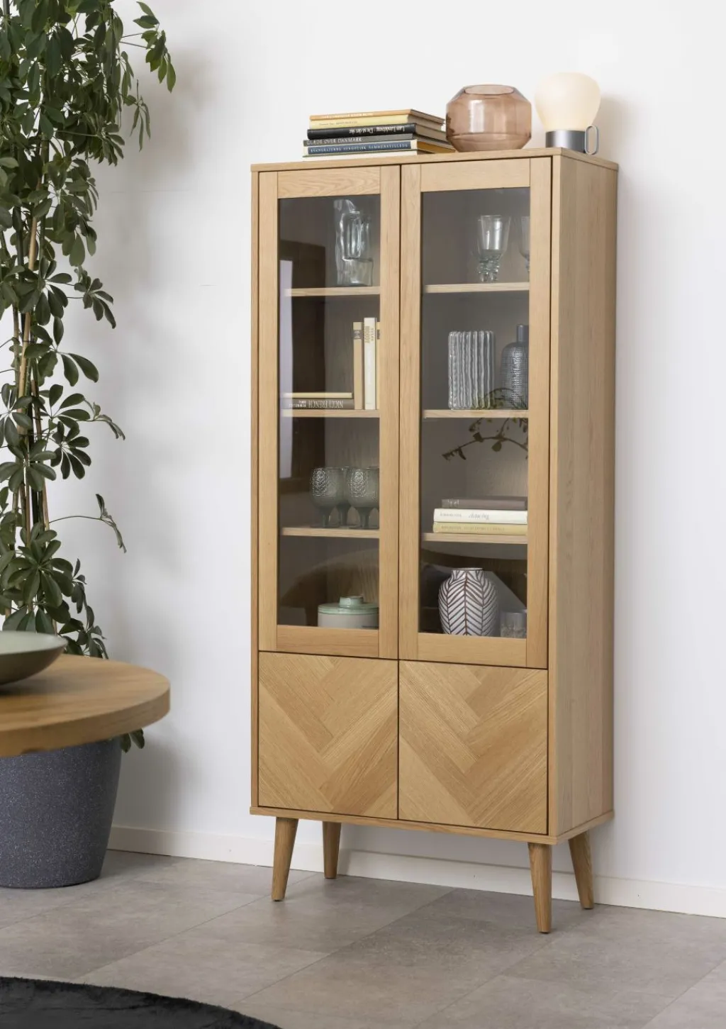 Caisson et façade : placage chêne (Chine), laqué / verre