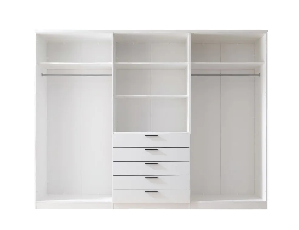 Répartition intérieure : 2 parois médianes ; à gauche et à droite, à chaque fois, 1 tablette et 1 barre de penderie ; au centre : 2 tablettes