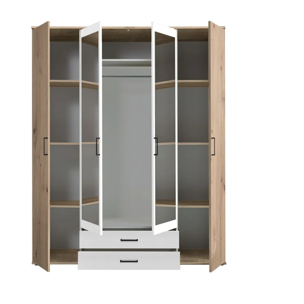 Répartition intérieure : 2 parois centrales ; à gauche et à droite, à chaque fois, 3 tablettes ; au centre, 1 tablette et 1 barre de penderie
