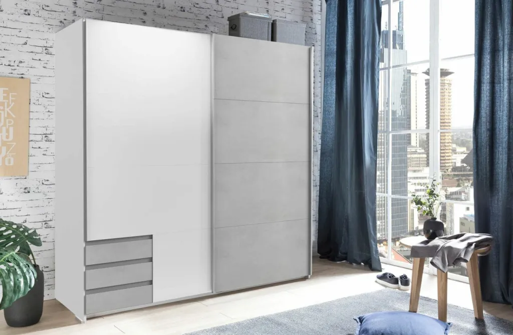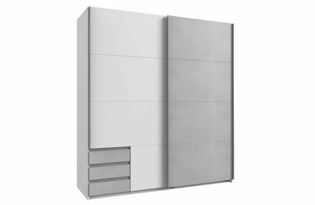 ton blanc avec contrastes (porte de droite et tiroirs) aspect béton gris clair