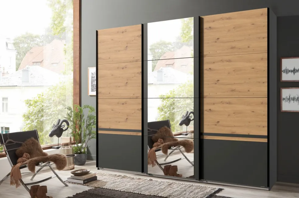 Caisson et façade : ton graphite avec contrastes décor chêne Artisan / miroir
