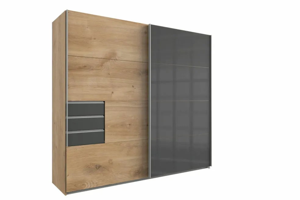 Façade : décor planches de chêne avec tiroirs ton graphite et une façade de porte en verre gris
