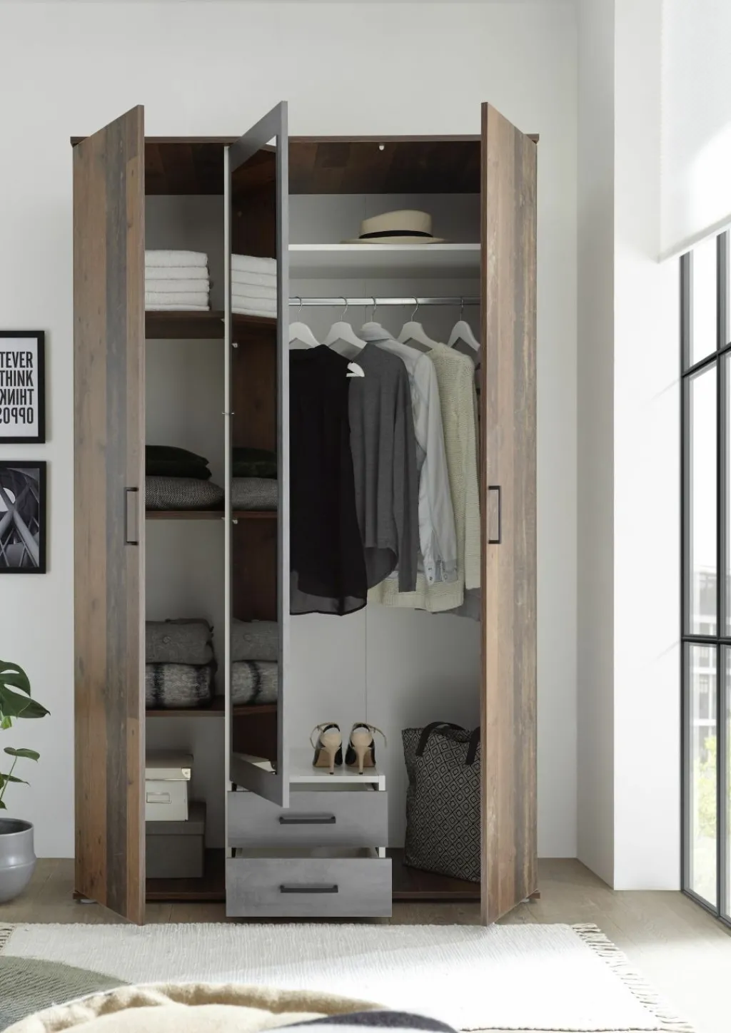 Répartition intérieure : 1 paroi médiane, à gauche 3 tablettes, à droite 1 tablette et 1 barre de penderie