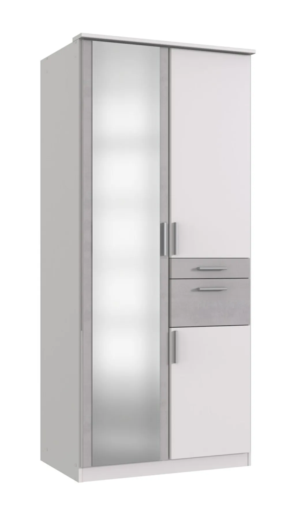 Caisson et façade : ton blanc et contrastes aspect béton gris clair / miroir