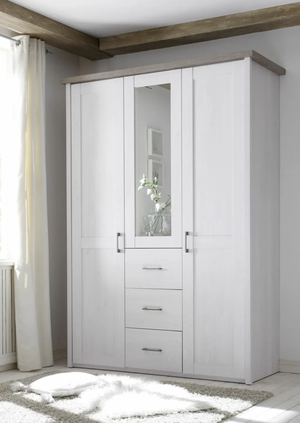 Armoire romantique dans un superbe style maison de campagne.Les façades imitation pin blanc rehaussées par un joli coloris chêne truffier confèrent à l’armoire à portes battantes LUCA un caractère ultra cosy. De plus, cette armoire à vêtements marque des points par son vaste espace de rangement et sa finition extrêmement soignée.