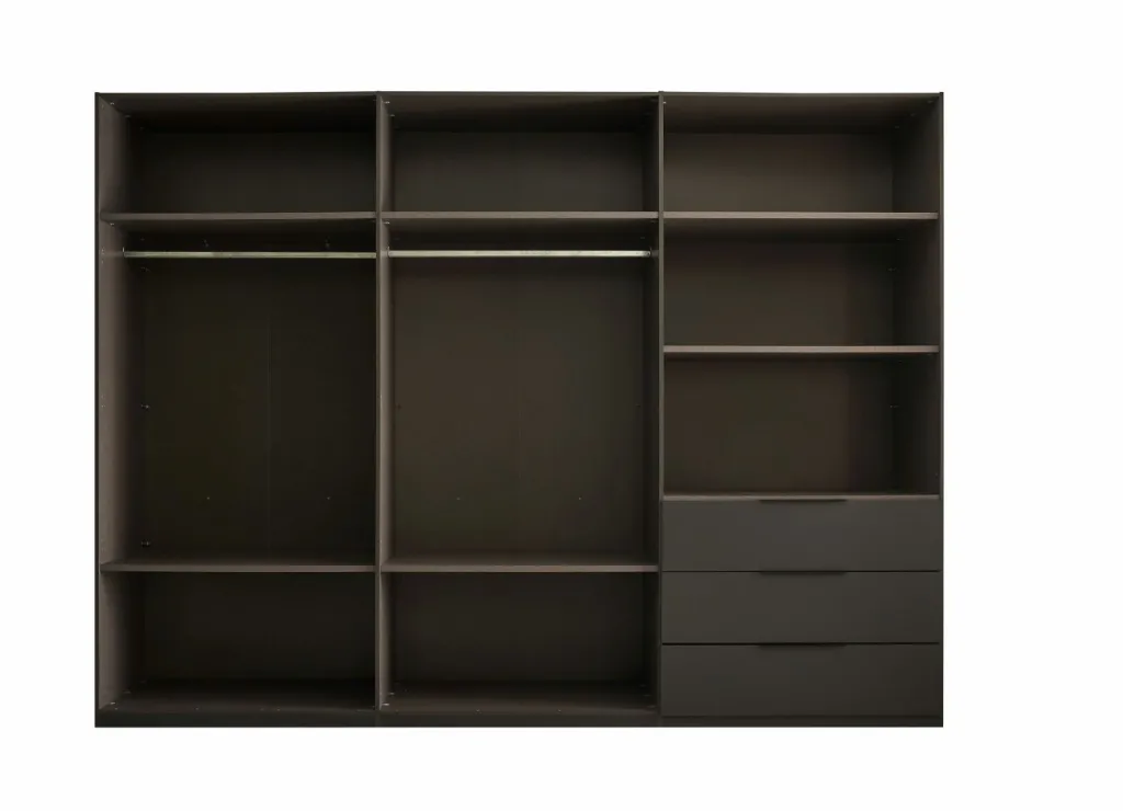Répartition intérieure : 2 parois médianes ; 2 tablettes au-dessus des tiroirs ; par compartiment, 1 barre de penderie et 2 tablettes derrière les grande portes