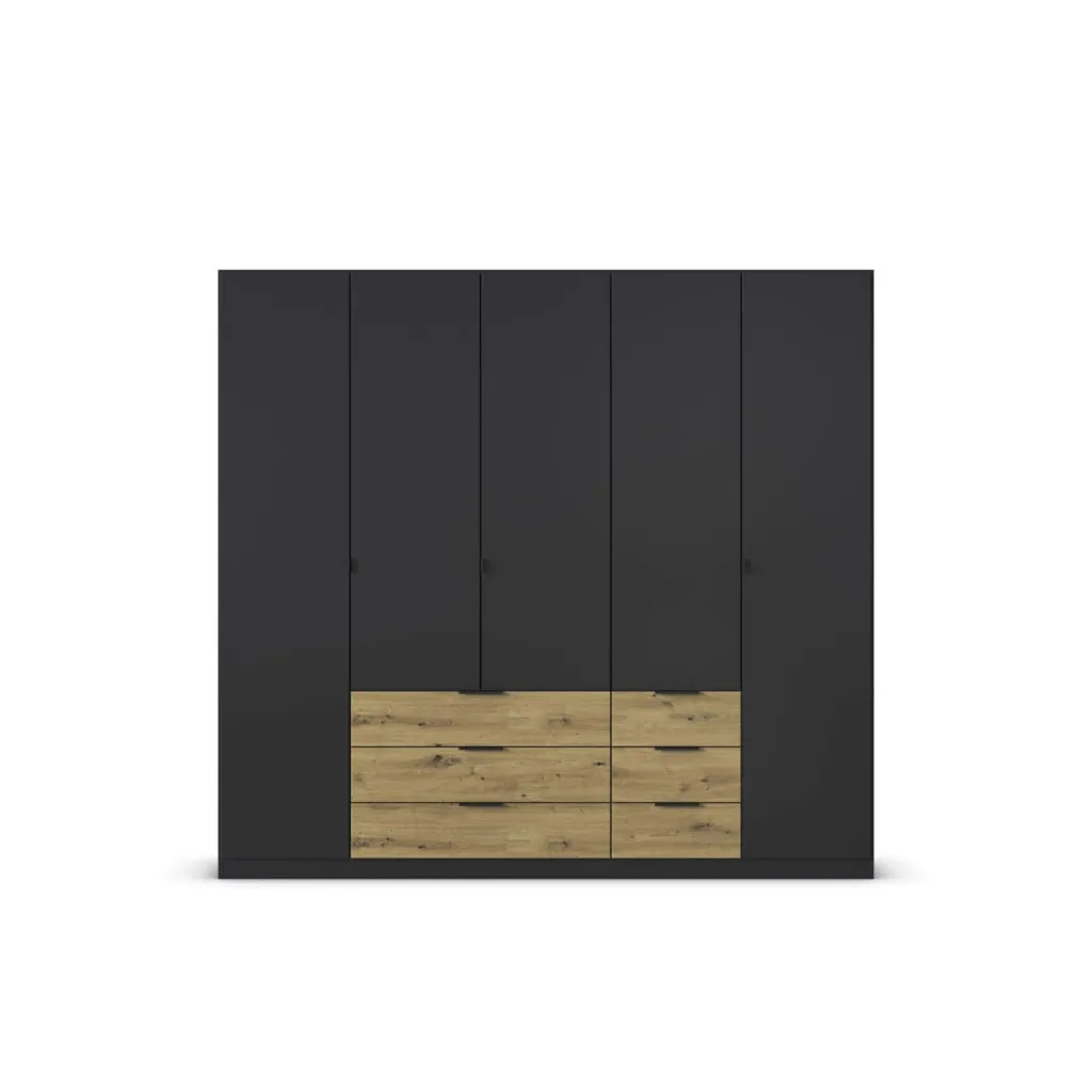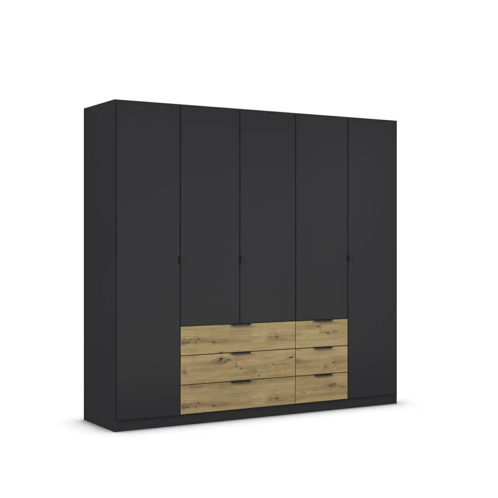 Façade : ton gris métallisé avec façades de tiroirs décor chêne Artisan