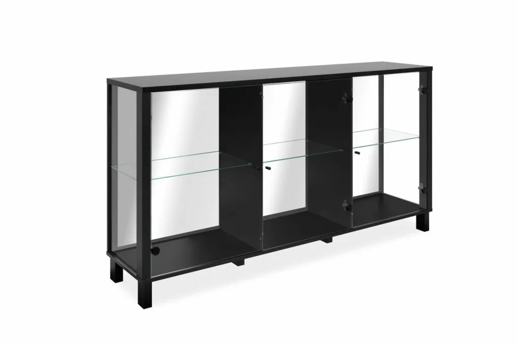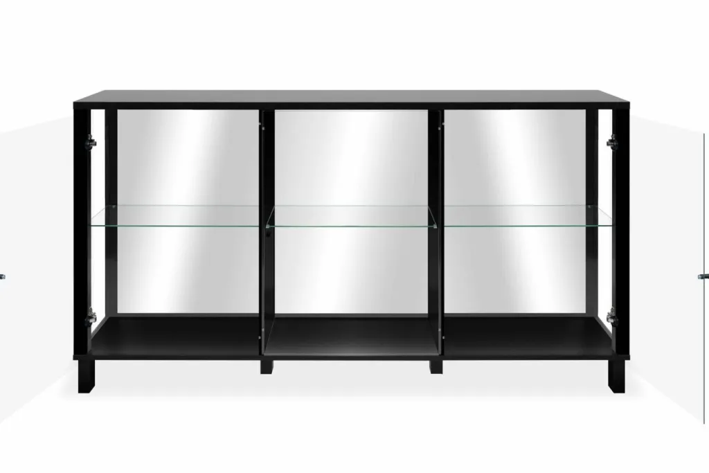 Ton noir avec fond miroir ; parois latérales et portes en verre