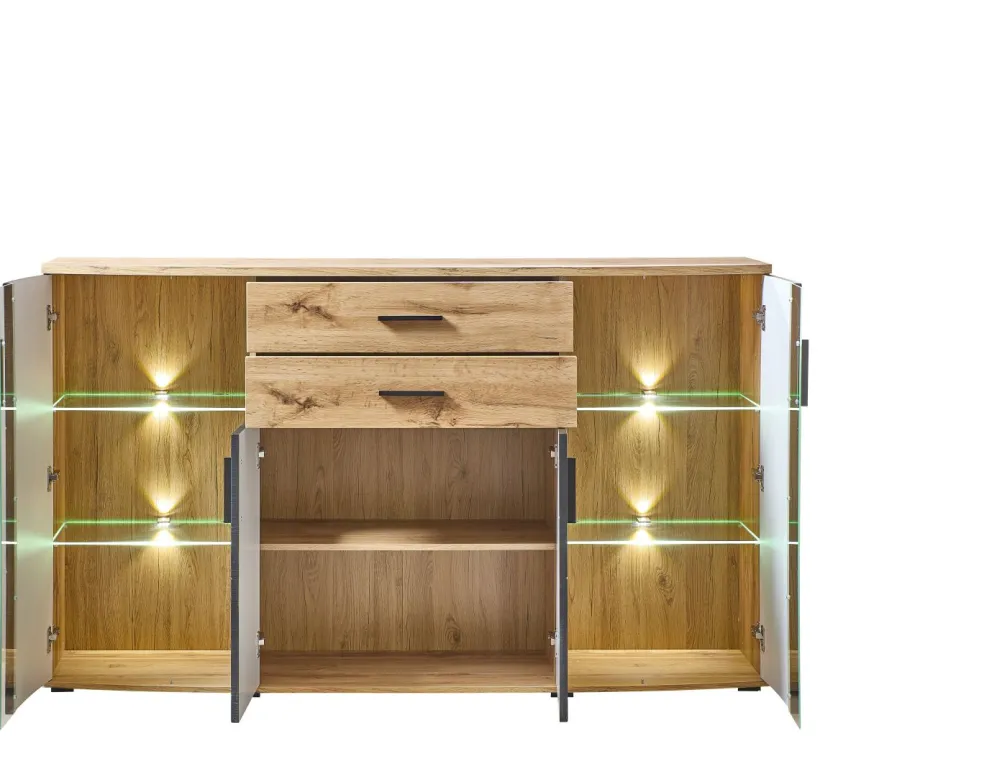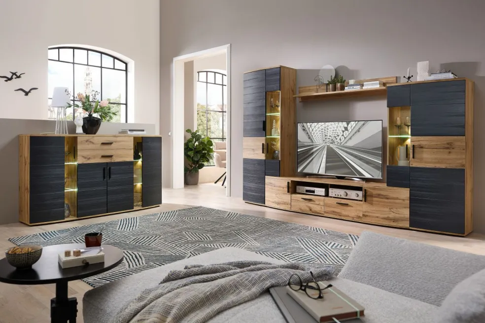 Façade : MDF texturé ton noir (panneau de fibres de bois de densité moyenne) avec contrastes en MDF aspect vieux chêne / verre transparent