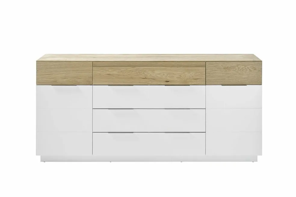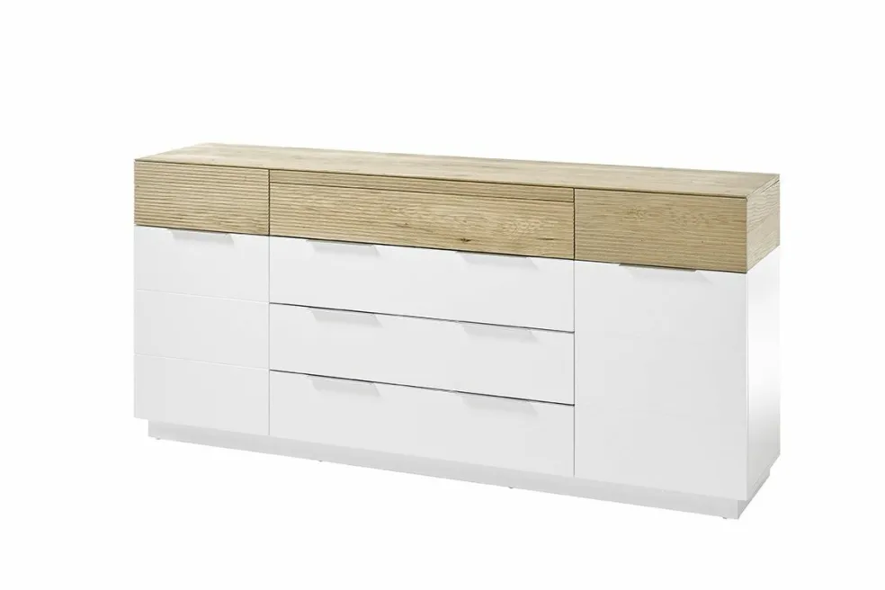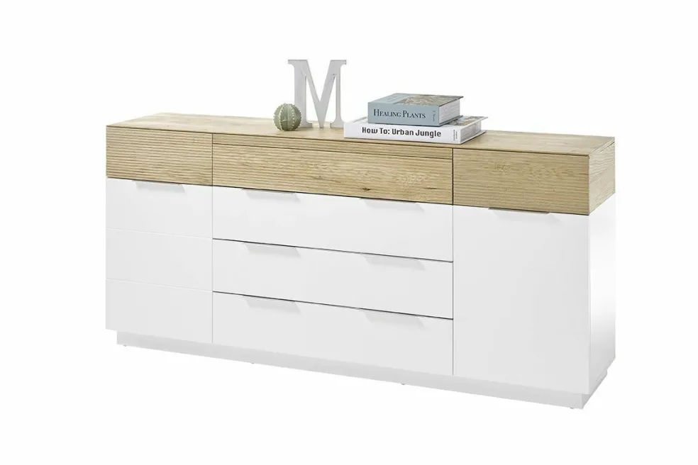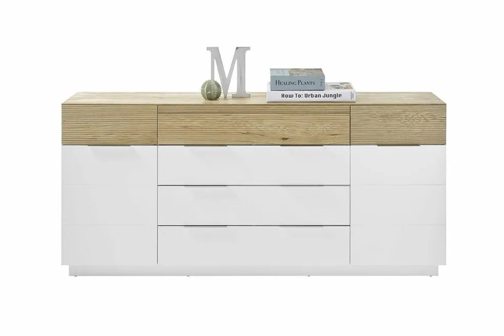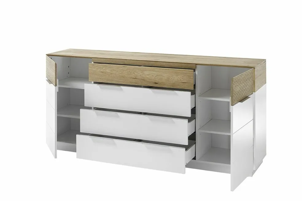 Façade : chêne massif (Pologne) à rainures et partie laquée ton blanc mat